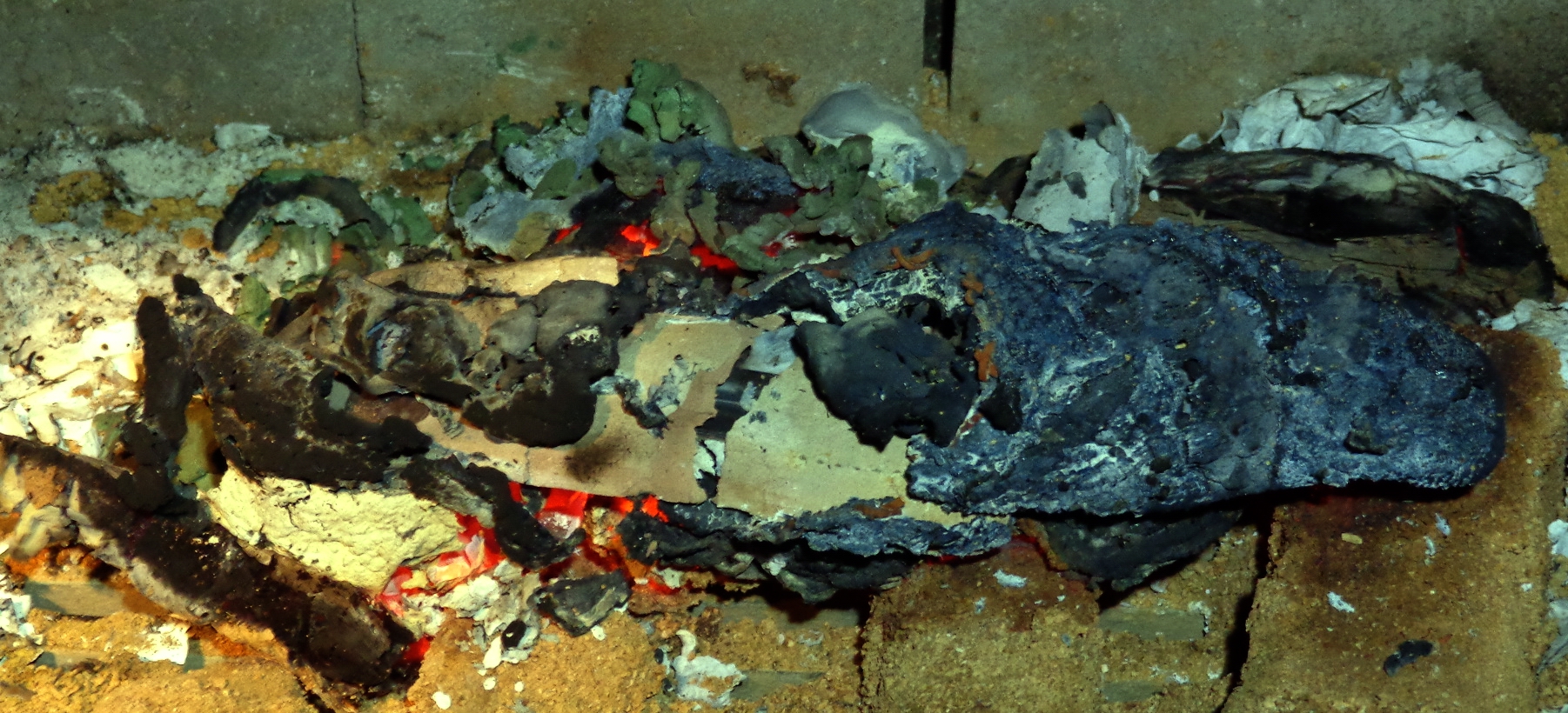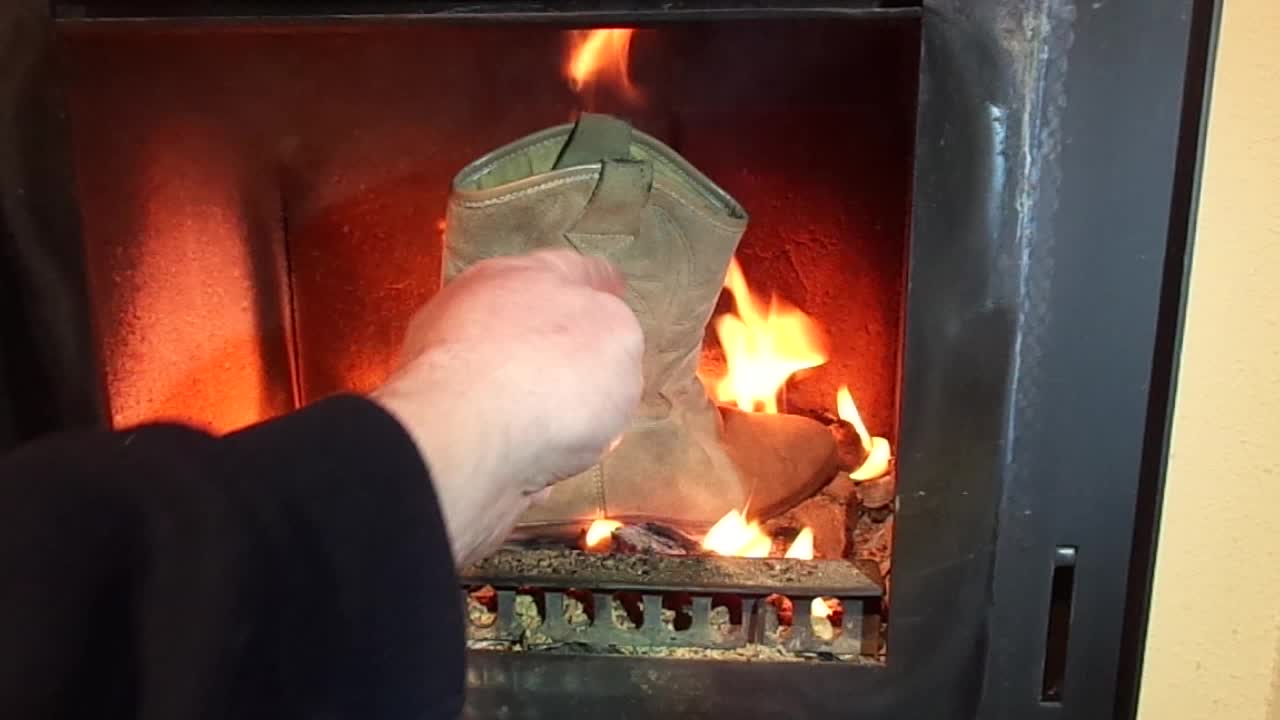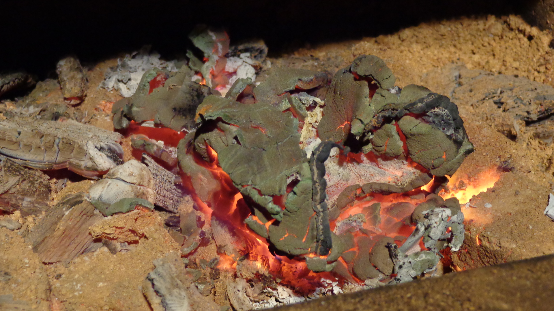 Während der Schaft außen langsam erkaltet, züngeln noch ein paar Flämmchen oben heraus. Im Fußbereich glüht der Stiefel auch noch.