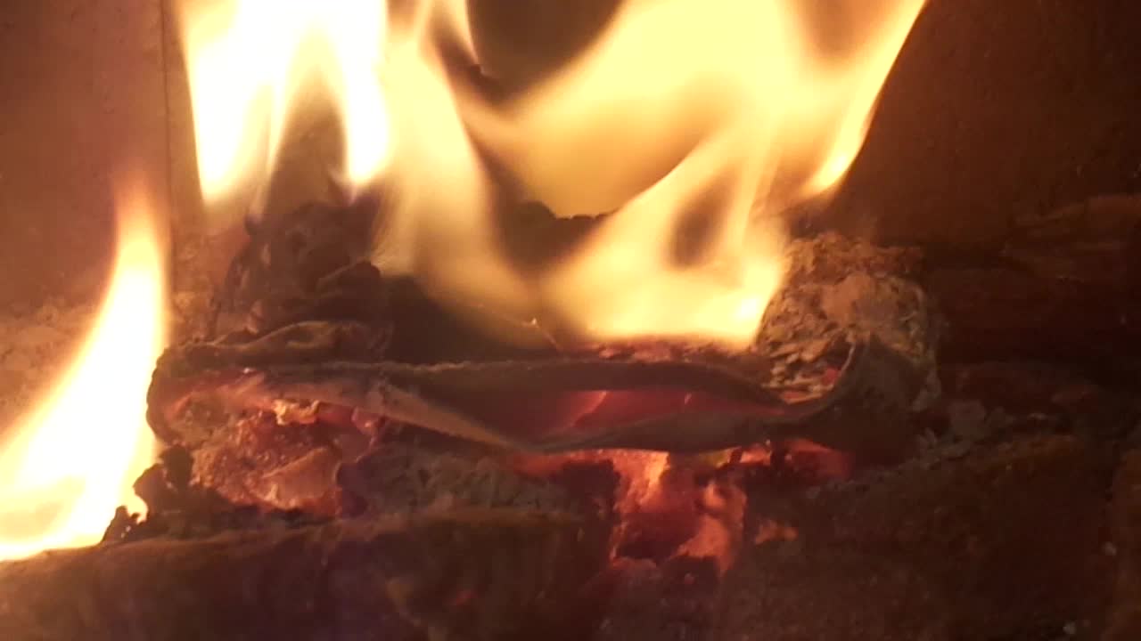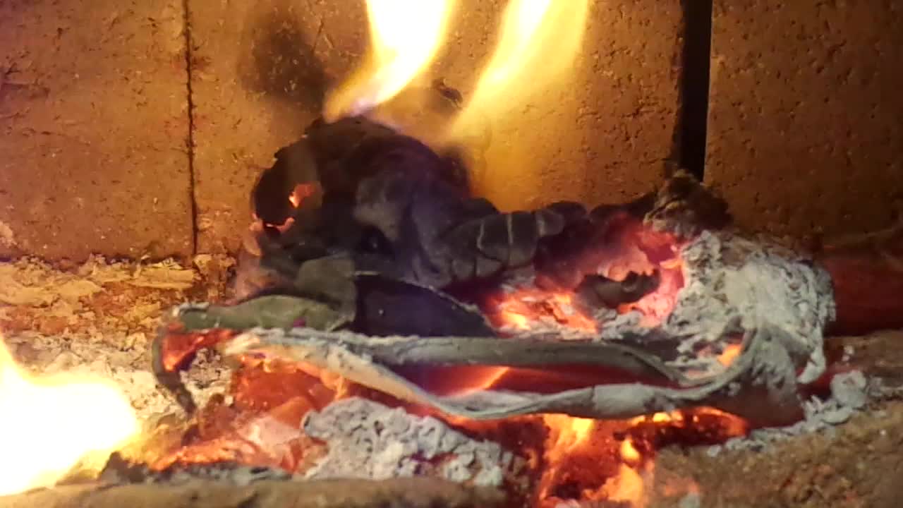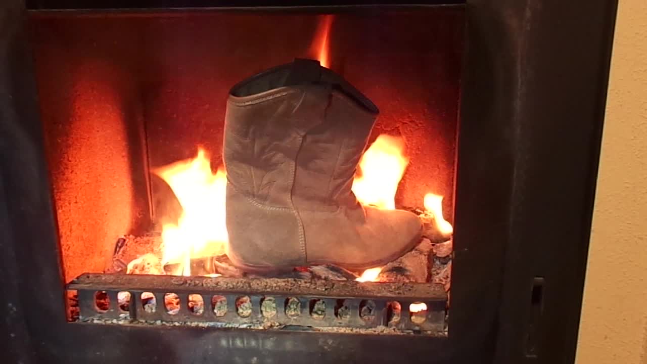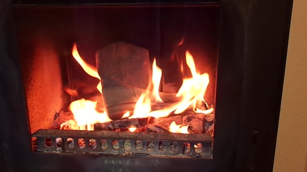 Langsam ziehen sich die Flammen zurück und zeigen, was noch vom schönen Stiefel übrig ist.