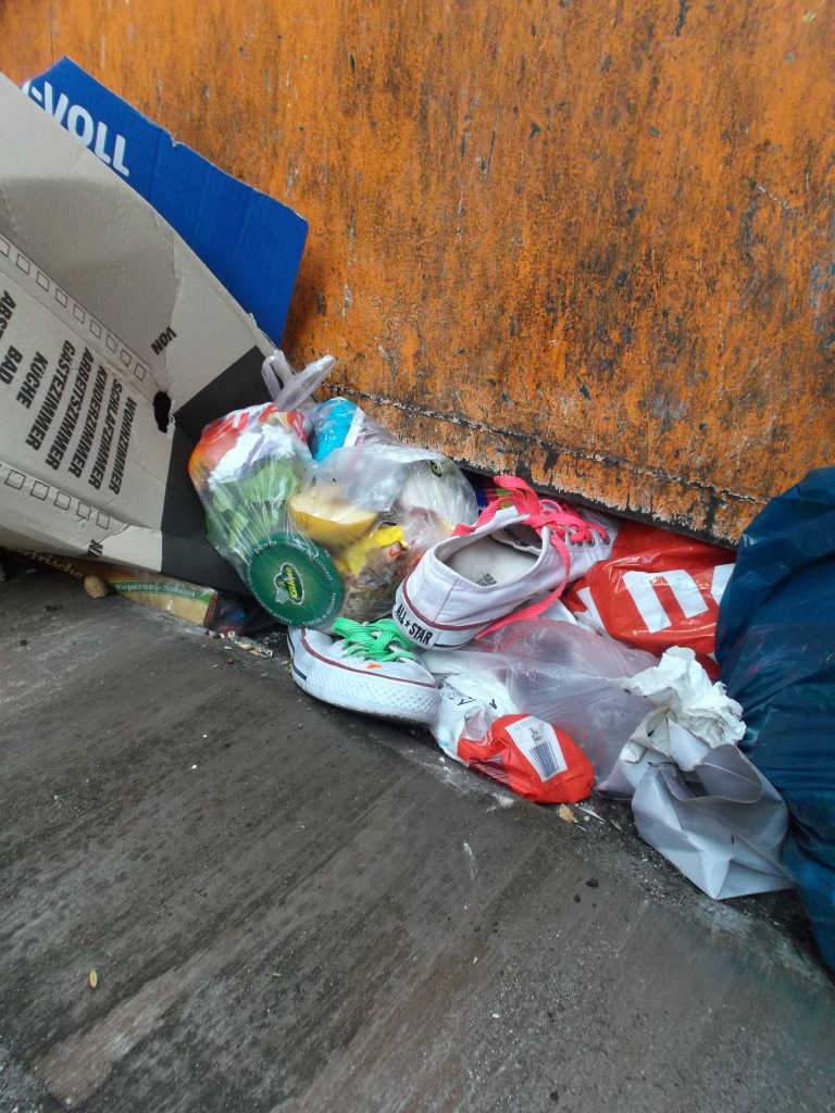 Es war gar nicht lo leicht, die durch den Pressdruck zwischen dem Pressschild und Mülltüten eingeklemmten frisch gepressten Chucks mit viel Kraft dem "Maul" des Pressmüllcontainers zu entreißen.
