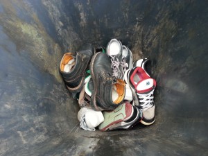 „Ja der Kleine ist gut angekommen. Ist ja ein lieber Kerl aber ein wenig verstreut. Hat der doch so viele Geschenke für die Familie Eingekauft das die nicht alle in den Koffer gepasst haben. Und so hat er dann zwei Paar alter Turnschuhe hier gelassen und bei uns in den Müll geworfen. Nur leider wie wir jetzt aus einer Mail vom Ihm wissen ist das zu Hause nicht gut angekommen. Nicht der Sache an sich denn das war fast schon so geplant nur hat er beim Packen nicht seine weißen Nike sondern die ihm eigentlich viel zu kleinen Nike’s von seinem Bruder eingepackt und folglich bei uns weggeworfen.“ So jetzt waren wir beim Thema – Alte Schuhe entsorgen! Jetzt sage ich, dass ich schon lange keine Kleidung mehr weggeworfen habe. Ich würde alles mit an meinen Arbeitsort nehmen und dort in einer Kleiderkammer abgeben. Dort würden die Sachen sortiert und kleine Reparaturen durchgeführt und dann an Leute mit wenig Geld verkauft. Seit kurzem würde ich sogar Schuhe mit dorthin nehmen. Meist wären die ja noch gut und zu Schade um als Müll verbrannt zu werden. In der Kleiderkammer würde auch ein pensionierter Schuster mit helfen und die Schuhe vor dem Verkauf prüfen und kleine Reparaturen daran machen. Und was wirklich nicht mehr gehen würde weil kaputt oder unzumutbar (ich rümpfte die Nase) würde dann an einen Altkleiderverwerte weiter gegeben. Das würde dann pro kg Kleider bzw. Schuhe noch ein paar Euros bzw. Cent geben.
