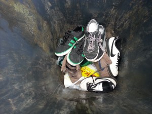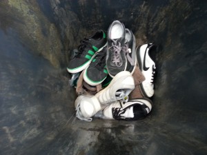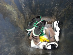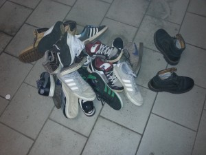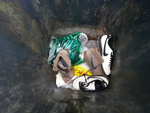 „Angefangen hat das mit den beiden Turnschuh Paaren von dem kleinen Franzosen, weiter ging es mit den alten Turnschuhen von unserem jüngsten – alle zu klein geworden aber eigentlich noch brauchbar. Dann bekam unser große Post von „PlanetSport“ mit zwei Paar neuen Schuhen und meine Frau hat sich durchgesetzt dass jetzt auch ein Paar alte Schuhe von ihm aus dem Schuhschank verschwinden müssen. Und da er sich nicht selber darum gekümmert hat wurde ich damit beauftragt und so kamen drei weitere Paar in den Müll weil zu klein, lange nicht mehr getragen bzw. ein fast noch neues Paar mit abgelöster Sohle. Und da ich nun mal am Schuhschrank war habe ich dann noch meine fast neuen schwarzen Boots weil zu eng gleich mit entsorgt- aber ohne Senkel, die konnte ich noch anders brauchen. Wie ich meine Boots da so in der Tonne sah fraget ich mich zwar kurz ob es da keine bessere Verwendung dafür gebe aber so war es einfach und bequem gelöst also Tonnendeckel zu und aus den Augen aus dem Sinn.