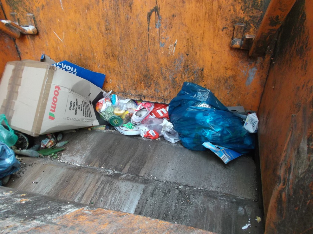 Es war gar nicht lo leicht, die durch den Pressdruck zwischen dem Pressschild und Mülltüten eingeklemmten frisch gepressten Chucks mit viel Kraft dem "Maul" des Pressmüllcontainers zu entreißen.
