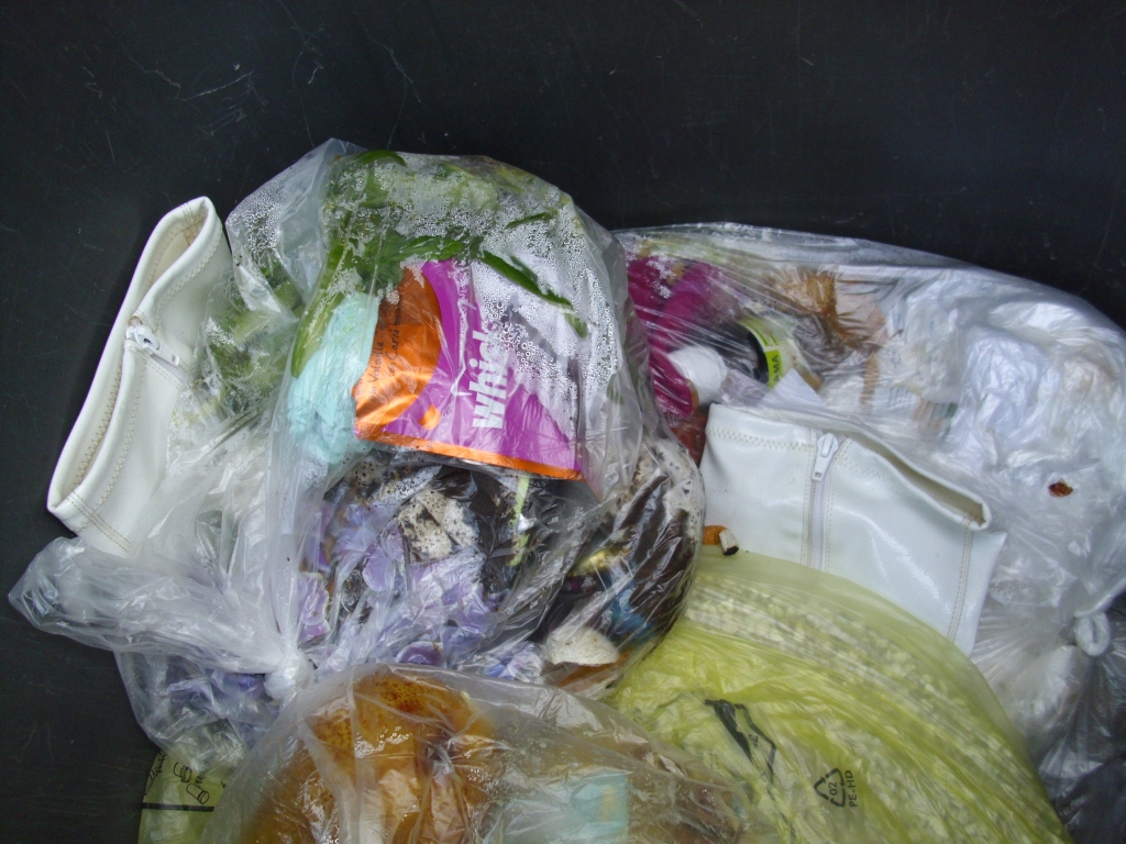 Ganz unten im von mir geöffneten Küchenmüllbeutel lag noch eine Handtasche. Die hatte einiges an Siff abbekommen.