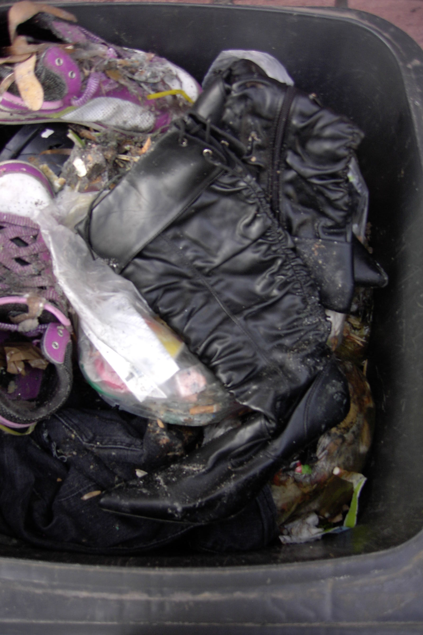 Als dieser Müllbeutel dann in der Tonne lag, entdeckte ich die mir zuvor verborgen gebliebenen schwarzen Stiefel, die unter den Skechers im Siff steckten.