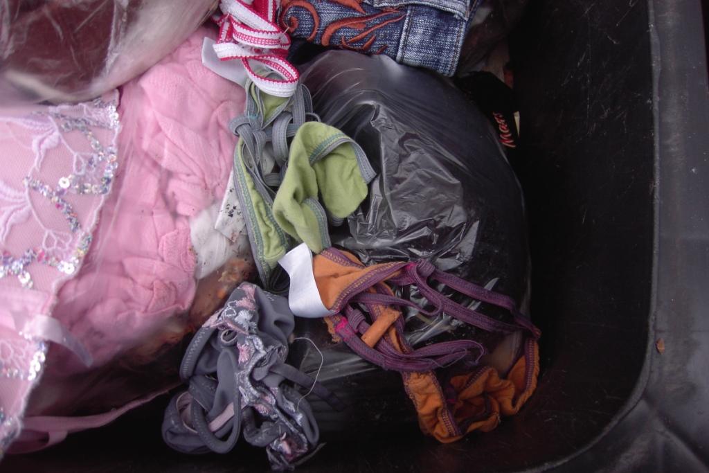 So sauber wie dieses eine Mal bleiben die geilen Klamotten selten in der Mülltonne über einige Tage. Doch auch bei diesen süßen Frauenlumpen sollte die Mülltonne "gewinnen", denn nach über einer Woche in einer stinkenden Restmülltonne reduziert sich der Wert dieser geilen Sachen auf ihren Heizwert, denn vom berühmten "Duft der Frauen" ist dann nichts mehr zu erahnen. :twisted:
