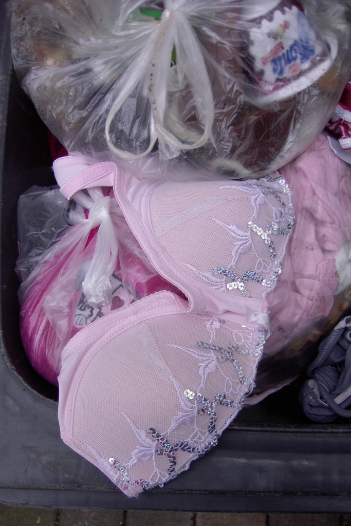 Ein ausrangierter BH musste auch in den Müllbeutel und durch Zufall war er gar nicht so sehr eingesaut; recht selten bei "saftigen" Essensresten im Küchenmüll, die sich zersetzen.