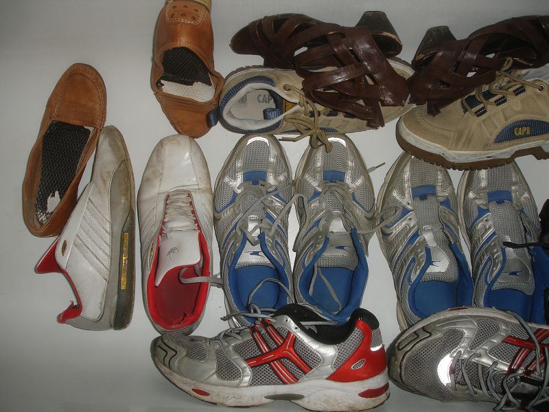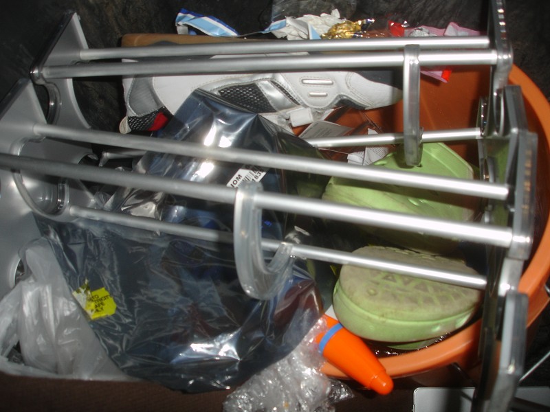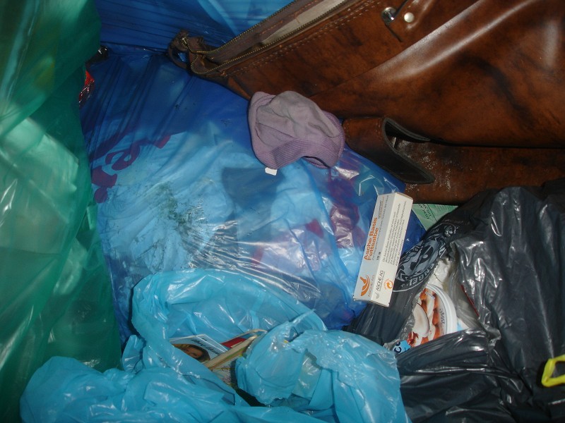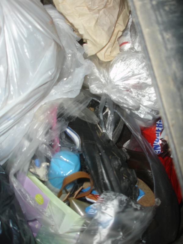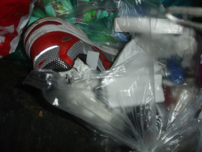 Zurück zu den größeren Restmülltonnen: Eine Tüte voller Joggingschuhe und einem Paar Sandalen.