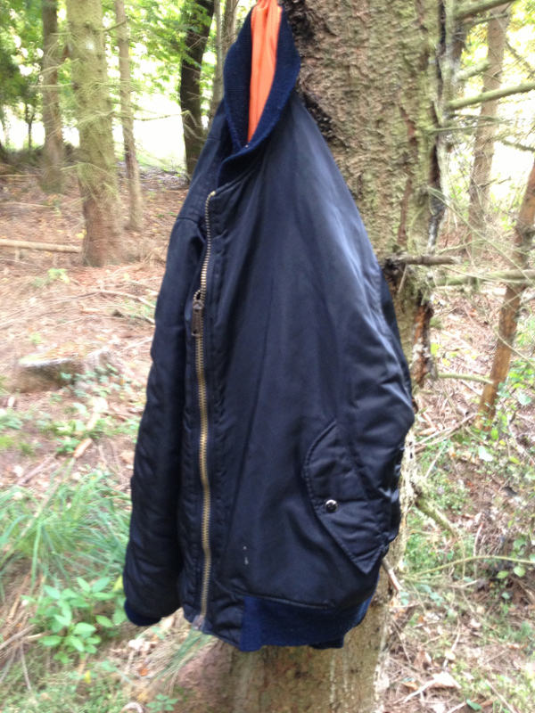 Hab die beiden Jacken vor einem Vierteljahr in den Wald gebracht damit sie dort langsam zerfallen. Die rote ist um einen Baum festgemacht.Auf dem Baum sitzen scheinbar Vögel die das geile ding ständig vollsch....