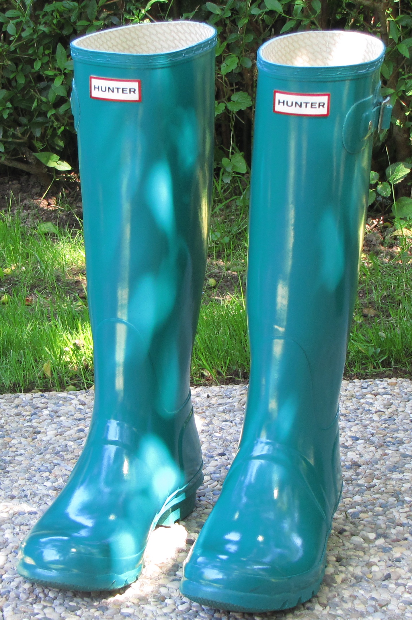 Habe mir auch Hunter Gummistiefel zugelegt. Die Tall Gloss in Smaragdgrün. Tolle weiche Gummistiefel in Gr 42. Obwohl sie ihr zu groß sind schlüpft meine Freundin auch gerne rein, da sie barfuß leichter raus und reinkommt und sie mit ihren kräftigen Waden gut Platz darin hat.
