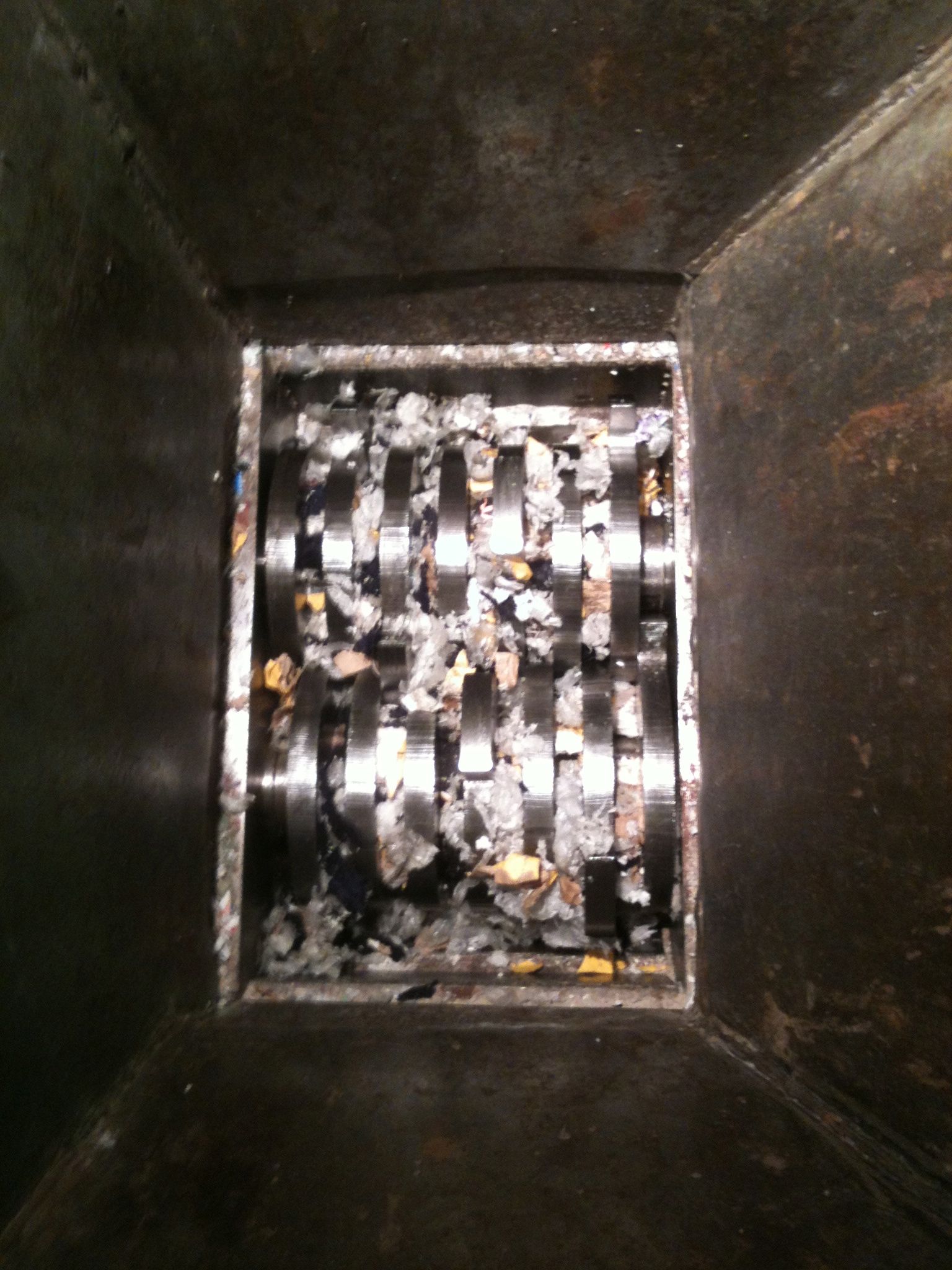 Übrigens, der Schredder ist ein kleiner Industrieschredder mit zwei Messerwellen und einem 7,5 PS Motor. Das Teil "frisst" praktisch alles ....