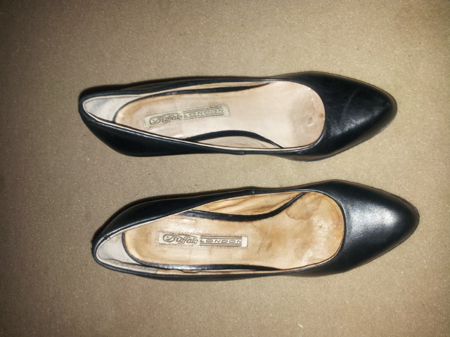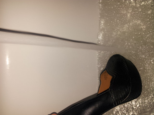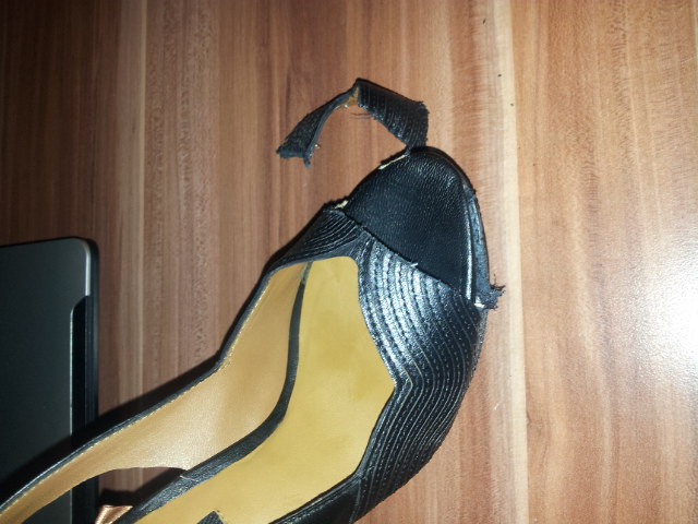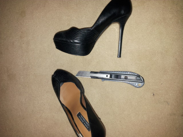 die Zaras mit Schleifpapier bearbeiten, Innenleben herausreißen, Sohle wie durchgelaufen herrichten, Autofahrerabsatz simulieren, Absatz brechen oder nach vorne biegen, an peeptoe aufschneiden und komplett teilen. Leder von der Sohle schneiden, die Schnipsel dann verbrennen