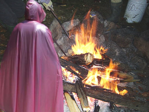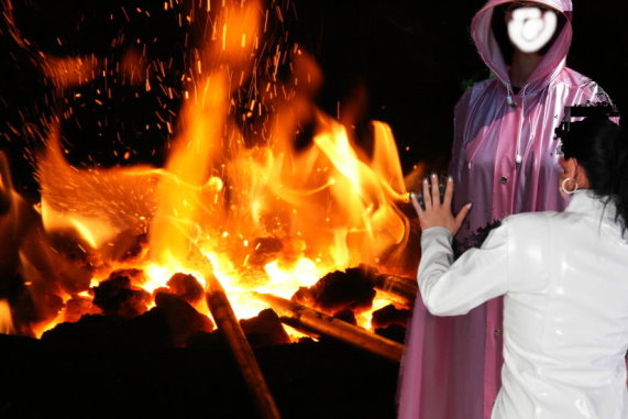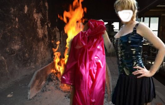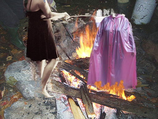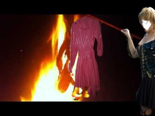 seine Plastikkleider vernichtete. Sie spiesste den Mantel auf und hielt ihn brutal über das Feuer, was Lea grossen Spass bereitete.In rasendem Tempo frassen die Flammen den Mantel auf.