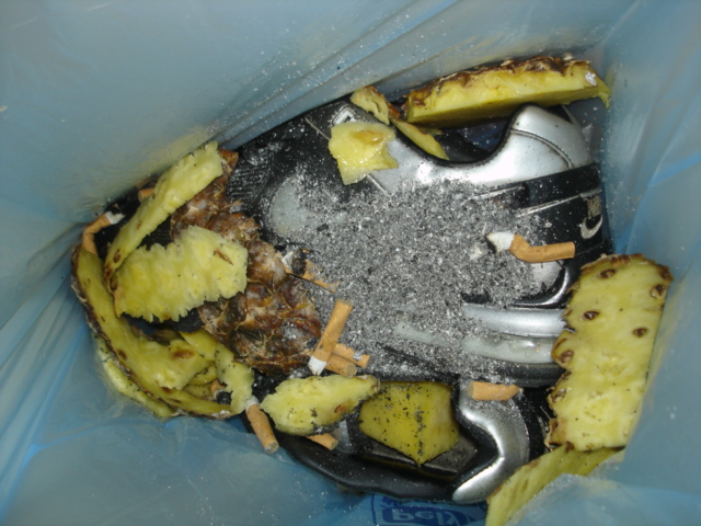 Und was halt sonst so in den Küchenmüll kommt. Tjo in kürzester Zeit aus teuren Markensneakers übelsten Müll gemacht.