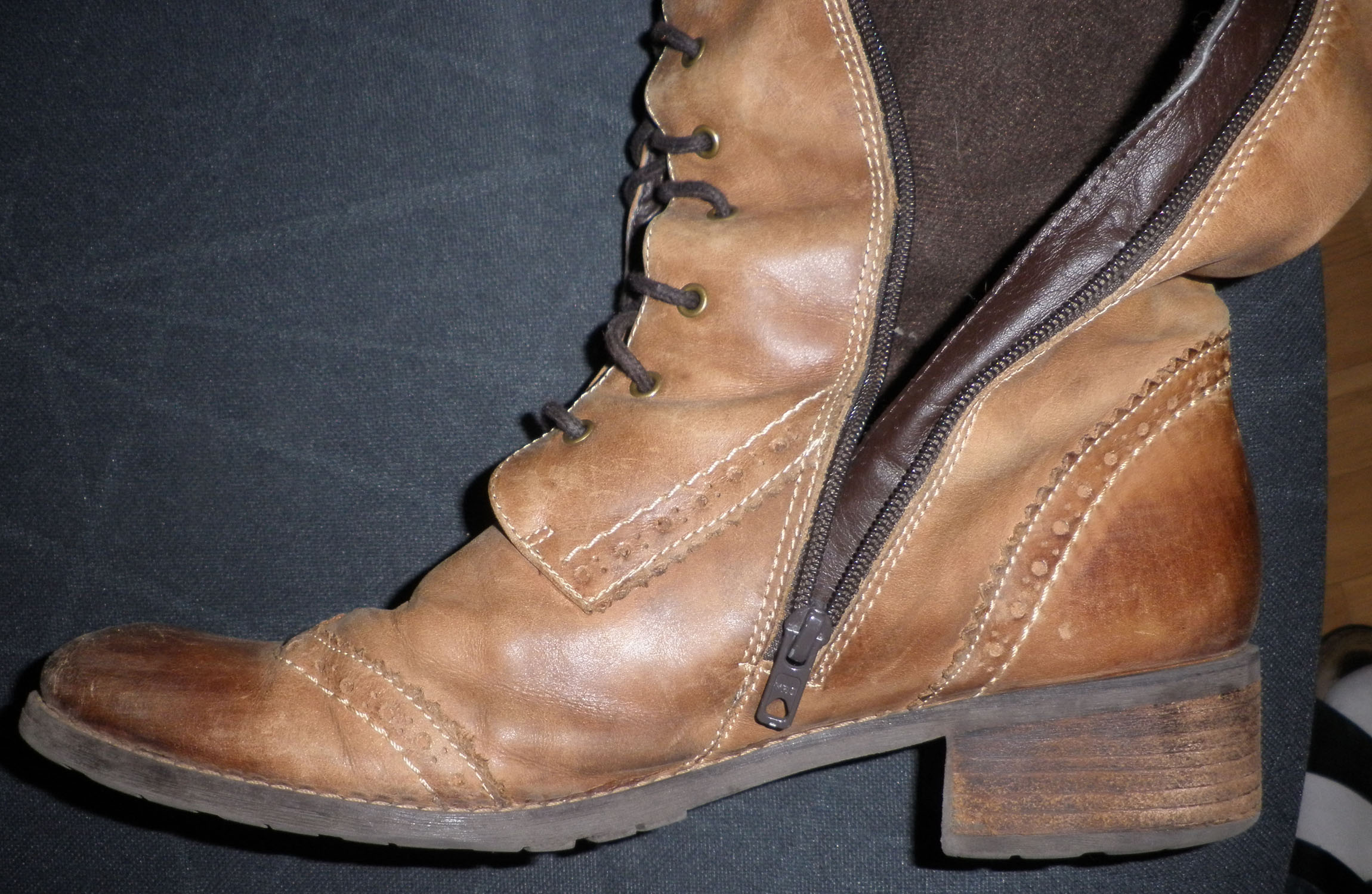 Auf der Rückfahrt nach Hause sah ich aus dem Augenwinkel einen Hinweis auf einen Trödelmarkt. Da ich etwas Zeit hatte, bin ich mal hingefahren. Nicht besonders groß, aber hauptsächlich private Anbieter, was einen Trödelmarkt ja interessanter macht. Nach einem kurzen Überblick erspähte ich diese Stiefel lieblos "hingeschmissen" unter einem Tapeziertisch. NAch meiner Begutachtung und der Freude, es mit Tamaris Größe 42 zu tun zu haben fragte ich die wohl ehemalige Besitzerin nach dem Preis. Sie sollten 12,00€ kosten. Ich fing an zu pokern und zählte die Mängel / Abnutzungen auf, bis ich schließlich die dünn gelaufenen Sohle erwähnte und meinte, für 5,00€ nehme ich die Stiefel mit. Da es schon zum Mittag hin ging, hatte ich wohl Glück. Sie sagte mir, naja, besser 5,00€ als nichts, wieder einpacken und anschließend wegschmeißen.