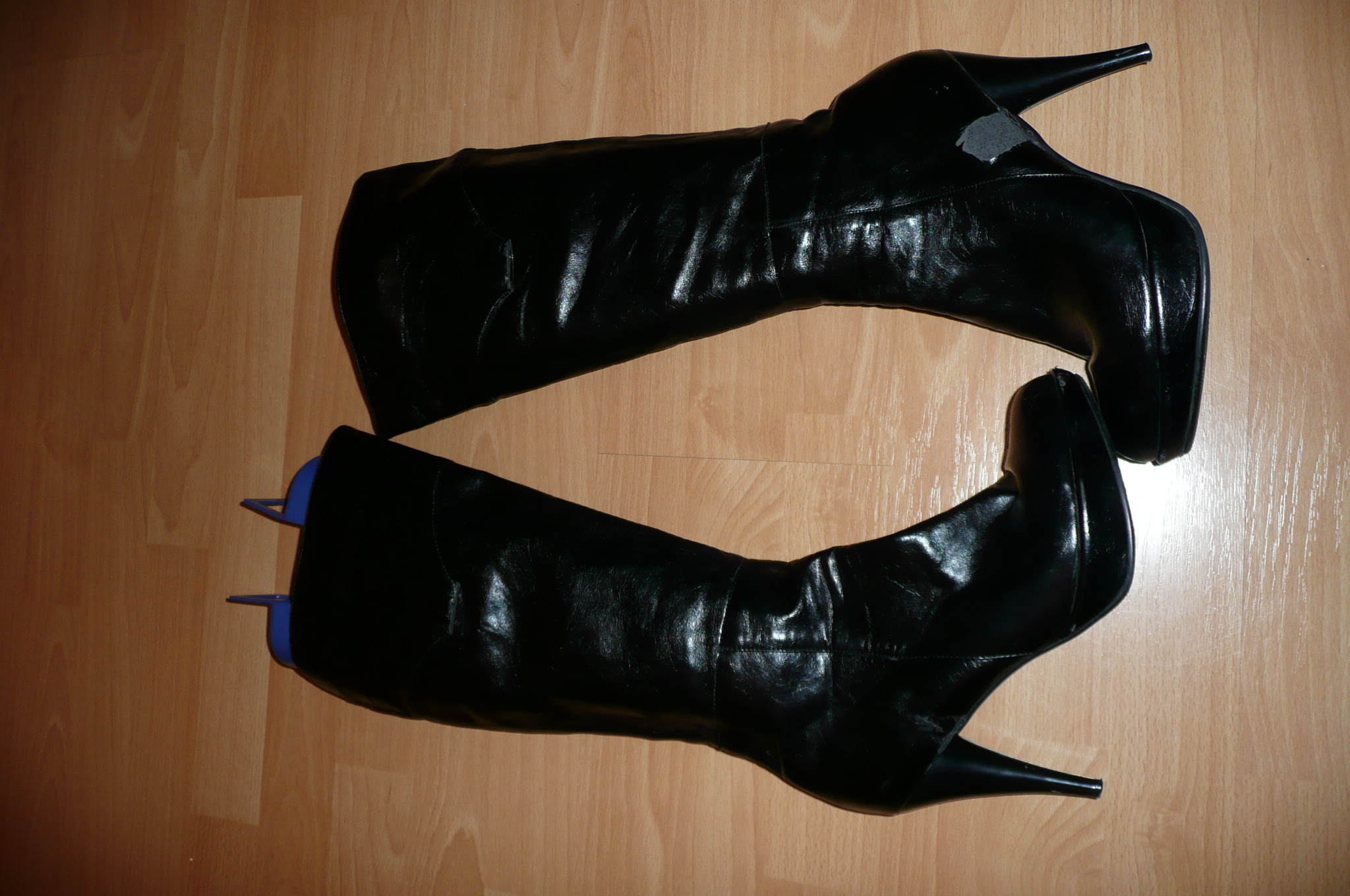 Genau genommen hat für das eine Paar schon das weitere Schicksal begonnen: Die schwarzen hohen Stiefel sind ein sehr schönes Modell und auch schon geil getragen worden. Irgendwann wurden mal ziemlich „unsauber“ die Riemen o. ä. abgeschnitten. In diesem Zustand waren die Stiefel natürlich untragbar und damit sofort Müll. Doch so kurz ab sollte es ja nicht gehen. Also habe ich nach Erhalt umgehend mit Akkuratesse alle Reste entfernt und auch den großen Schaden soweit möglich entfernt und behoben. Das erforderte etwas Aufwand, aber nun ist (fast) nichts mehr zu erahnen. :o :D