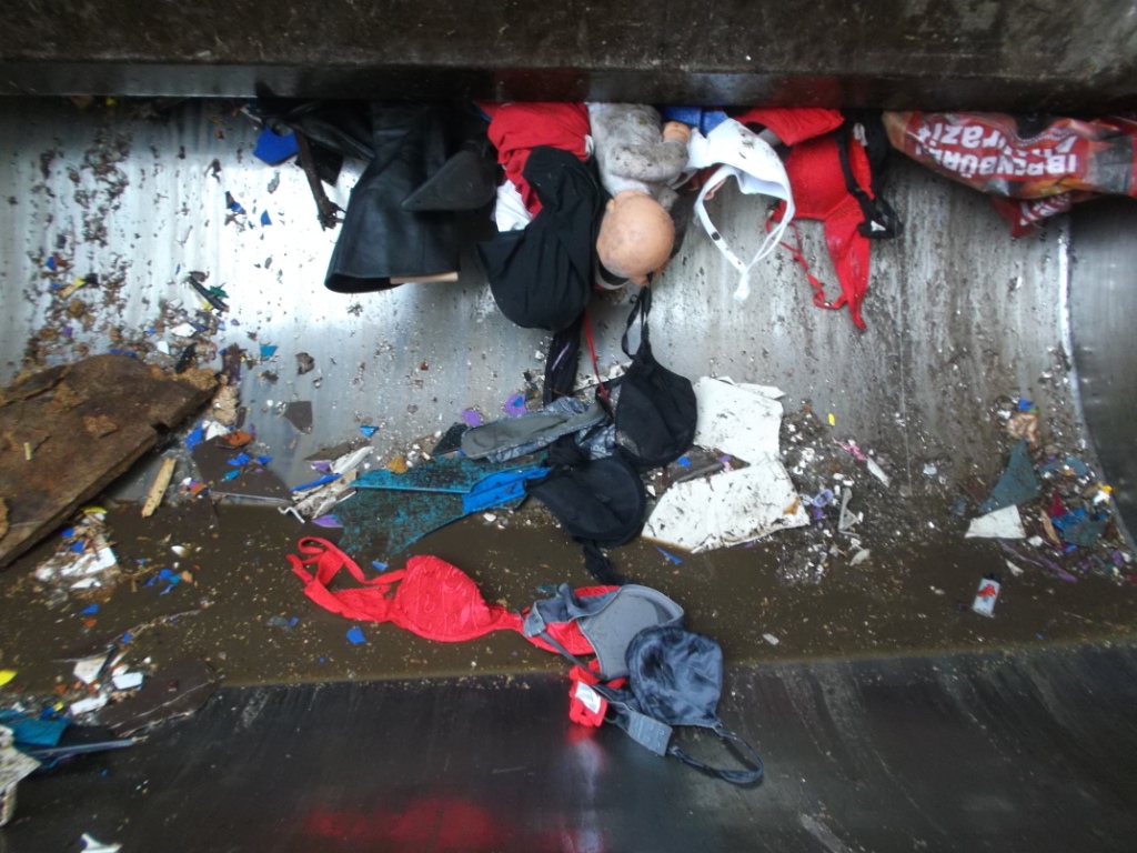 Ein Witz: Das Puppengesicht wurde durch den Pressdruck gegen die BHs gedrückt und mit Wange und Nase zog das Puppengesicht die sündige Wäsche mit in die Müllschüttung.