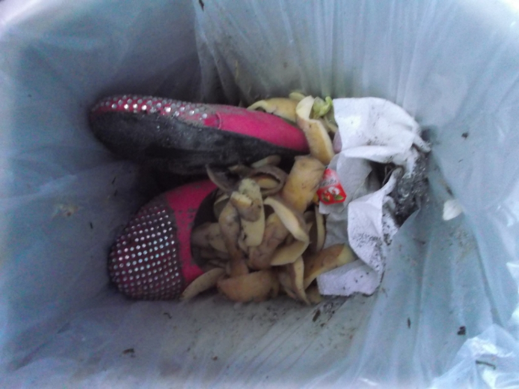 Gleich fünf Paar Girly-Schuhe zeigten sich total platt gestampft und total versaut in den Mülbeuteln.