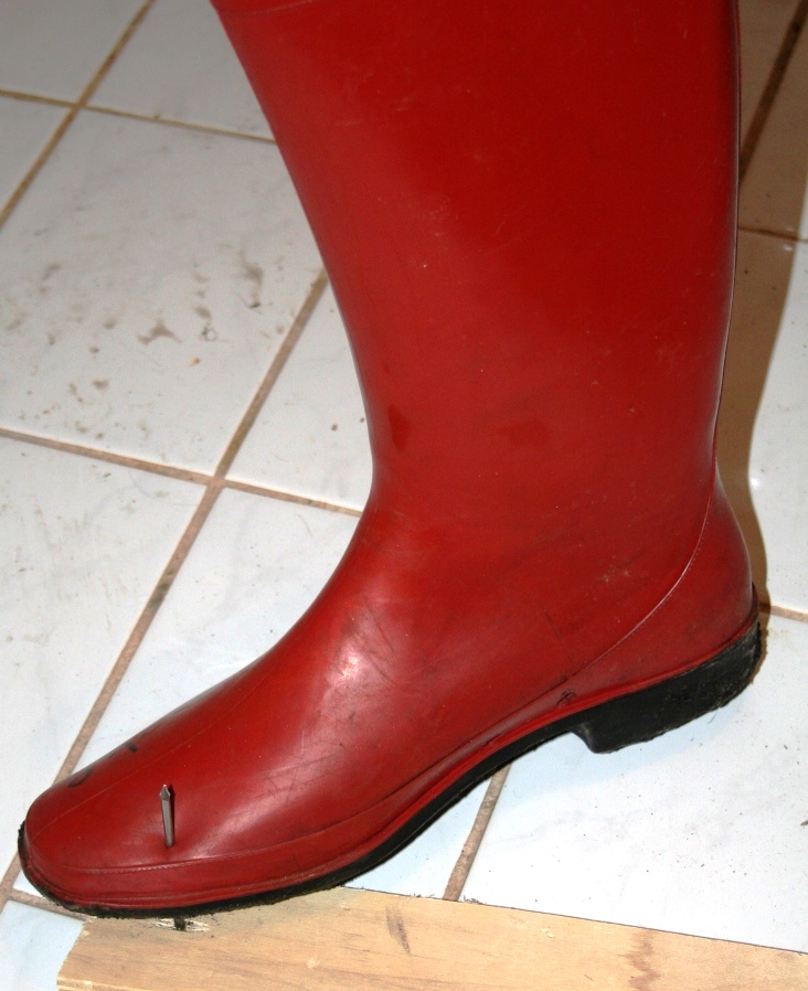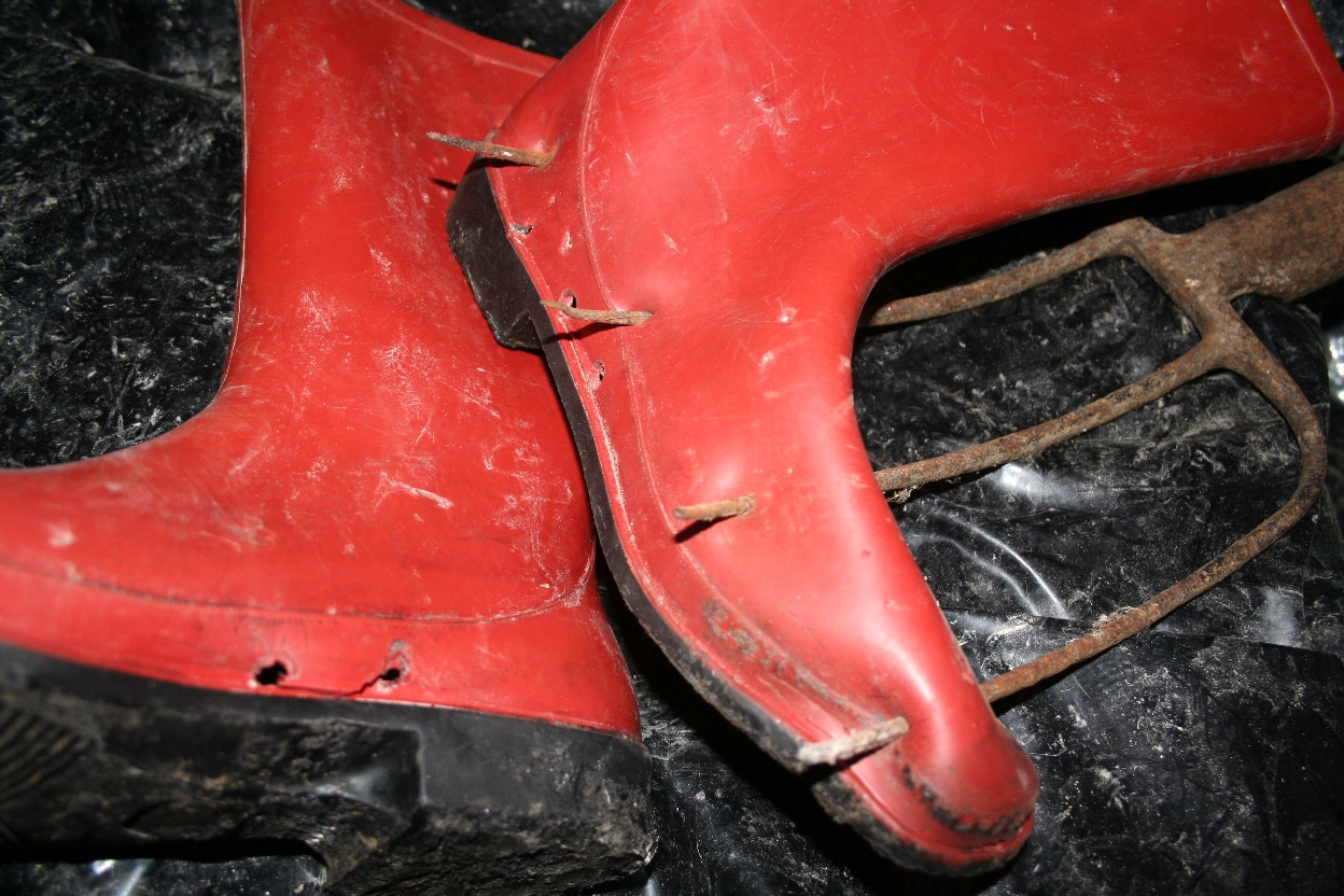 Die Gummistiefel machten Bekanntschaft mit der harten Realität. Mir machte es Spaß, den Stahl in die ehemals weichen und schönen Gummistiefel zu rammen.