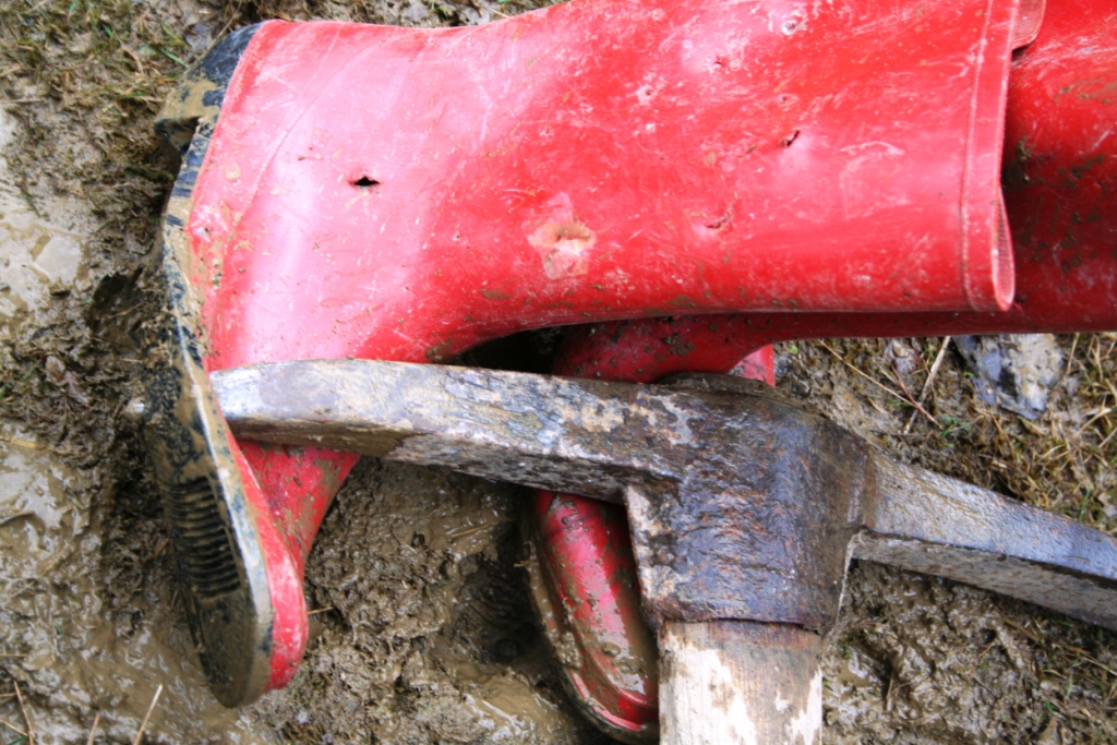 Auch in den linken Gummistiefel bohrt sich die Keilhacke willig hinein, um ein großes Loch zu hinterlassen.