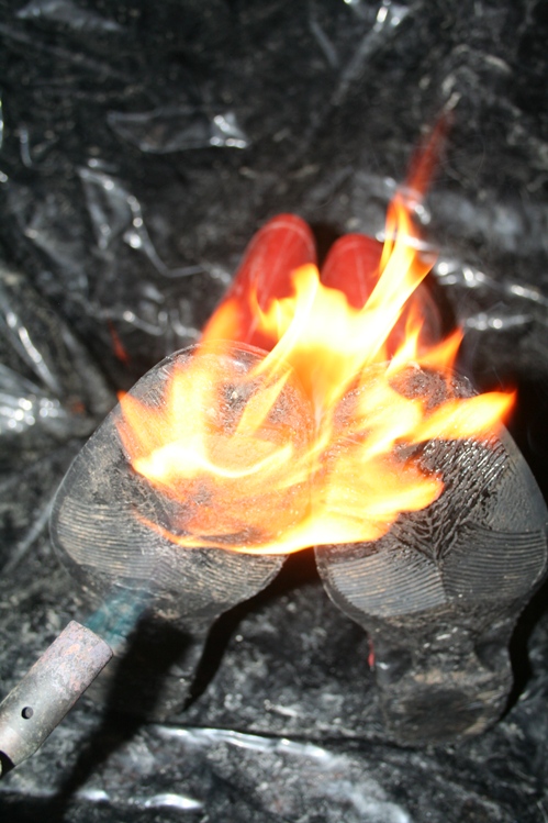 unter großen Anstrengungen habe ich meine ehemals liebsten Gummistiefel hergenommen. Wenn sie noch tragbar gewesen wären, dieses Schicksal wäre ihnen noch erspart geblieben. So aber mußten sie auf ihre Weise noch zu meinem Vergnügen herhalten. Bin noch unentschlossen, wie es weitergeht. Nur das Ende scheint ihnen sicher: Das wird wohl ein feuriges Vergnügen.
