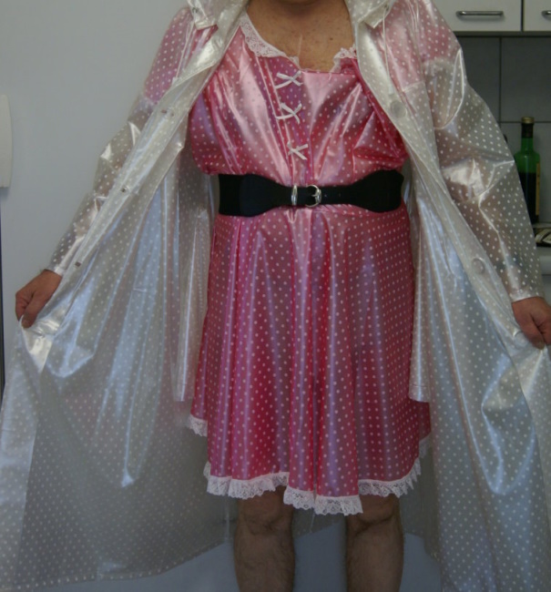Nach dem Mittagessen packte er den Plastik Mantel und das Kleidchen in eine Tasche, legte diese ins Auto und fuhr los. Nach einer halben Stunde Fahrt erreichte er den Wald. Er fuhr hinein und parkte bei einer Seitenstrasse. Nun begann er , die Kleider zu wechseln. Er zog das Platikkleidchen an und genoss dabei den herrlichen PVC Duft, der bei neuem PVC so intensiv ist. Doch kaum hatte er das Kleidchen angezogen, erschienen drei Damen, die er nur zu gut kannte: Daniela, Martina und Nora. Mike fuhr zusammen. Nora packte den Mantel mit den weissen Punkten und zog ihn Mike an. Sie dränge ihn ins Auto, setzte sich ans Steuer und fuhr los. Mike war es sehr unwohl. Das war ja eine richtige Entführung. Als er in den Rückspiegel schaute, sah er dahinter das Auto von Martina. Nora erklärte, dass sie zu Martina fahren. Dort würden sie ihm einen einmaligen Nachmittag bieten. Mike konnte sich vorstellen, was ihn und sein Plastikzeug erwartete. Den gestrigen Tag hatte er noch in bester Erinnerung .Bald waren sie bei Martina. Sie schleppten Mike hinter das Haus, wo Martina in der Brenntonne gleich Feuer entfachte. Bald züngelten die Flammen bis zum Fass Rand. Nora kam mit einer Filmkamera, sie wollte eine DVD brennen, damit Mike genügend Erinnerungen von dem folgenden Nachmittag haben wird.