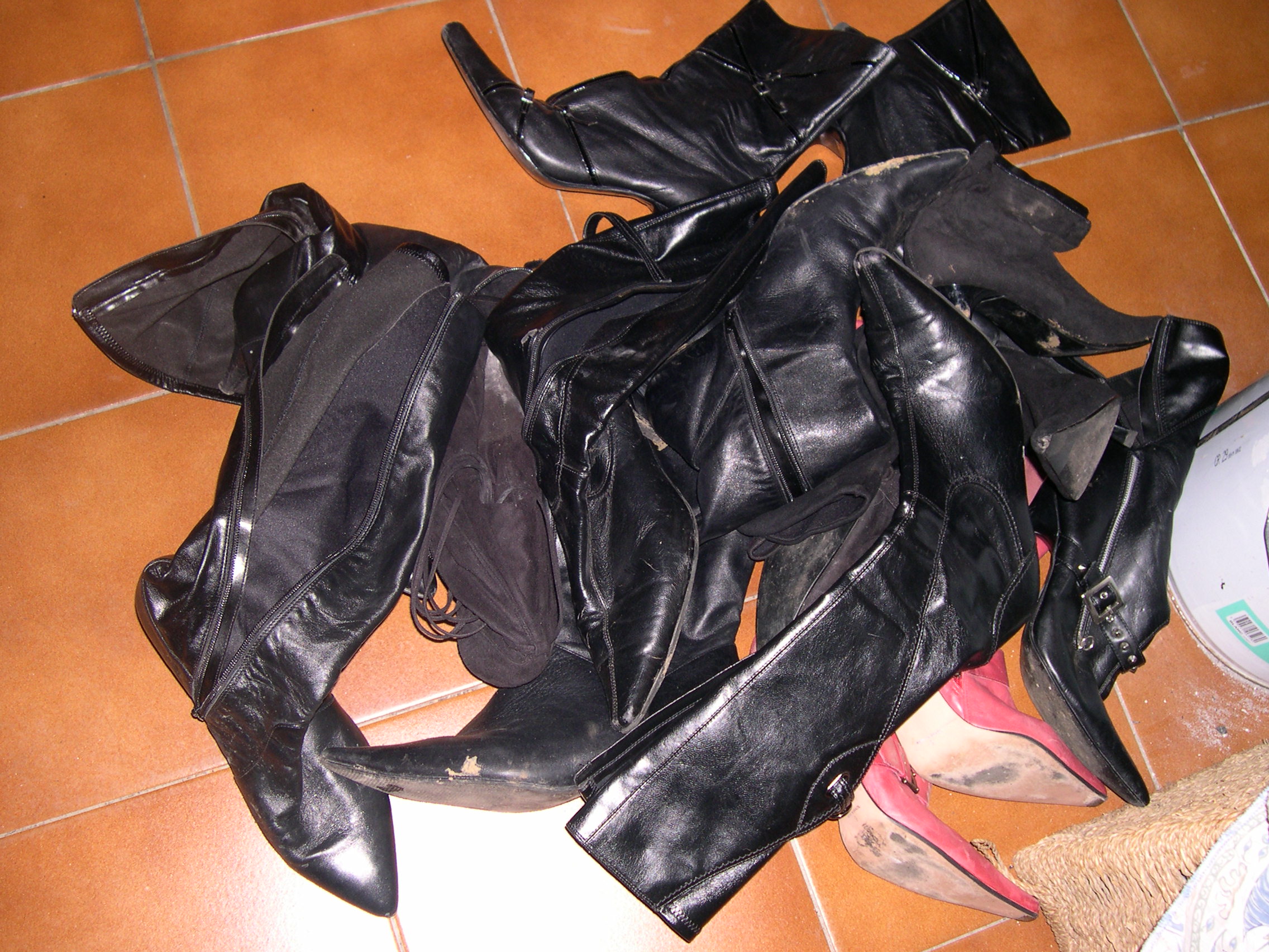 bonjour , hier j ai fait une promenade dans un vide grenier sur un parking de super marché , le nombres de femme qui ce débarrasse de leurs chaussures et bottes , c est incroyable , aux fils des allés et des étals , j ai pris quelques photos qui en dise long sur l avenir de c est bottes , toutes ne seront pas sauvé !!, une grande benne sur le parking attend les vendeur malheureux pour y déposé ce qui ne c est pas vendu , triste sort !!, j en ais sauvé quelque une pour poignée d euros !!