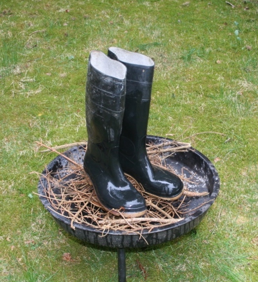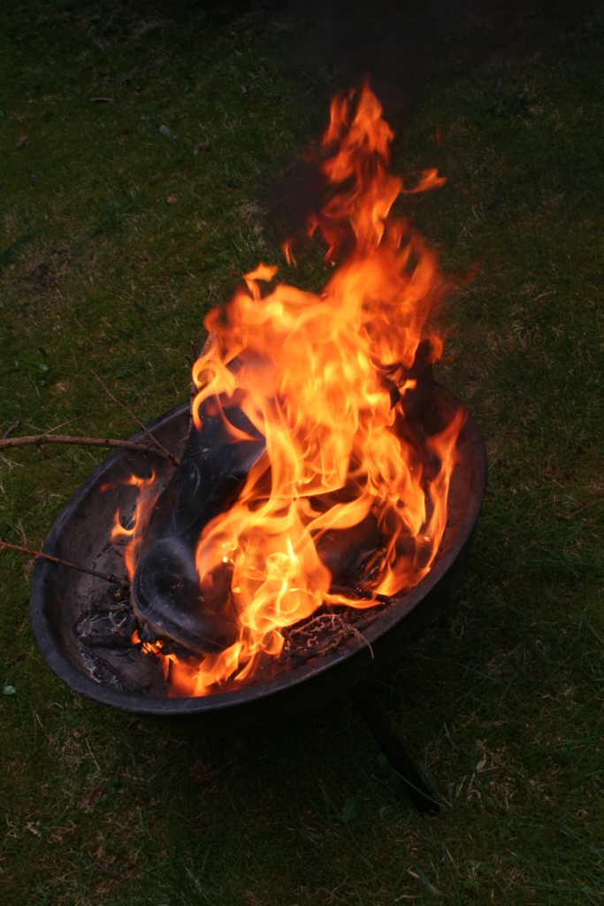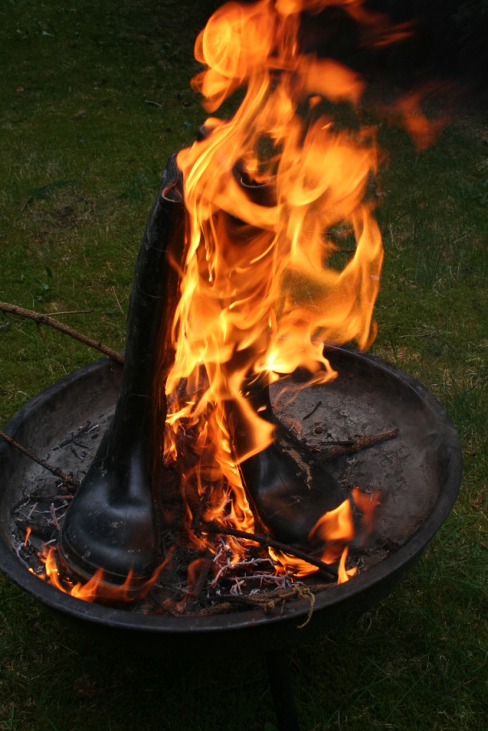 Gummistiefel brennen besonders gut, wenn sie aus Gummi sind. ( Es gibt ja auch welche aus PVC ) Trotzdem ist es ratsam, ein kleines Holzfeuer anzuzünden, bevor sie daraufgestellt und gegrillt werden. DIe Rauchentwicklung ist dann geringer und es geht auch schneller. Ein wenig flüssiger Grillanzünder verhilft ihnen am Anfang sogar noch mal zu etwas Glanz. Nach dem anzünden umzüngeln erste Flammen die Stiefel um sich gleich darauf in das Gummi zu vertiefen. Bald knickt der Schaft ein, ein Stiefel sinkt auf den anderen, das Gummi wirft Blasen, der typische Geruch brennenden Gummis liegt in der Luft, während die Flammen hell auflodern.