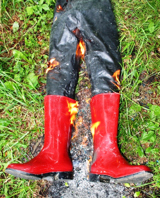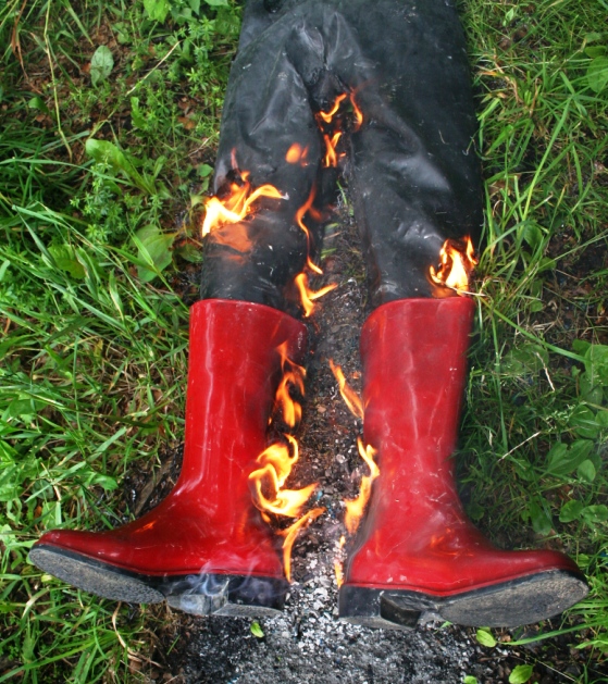 Die Gummihose war deutlich in die Jahre gekommen und die ehemals schönen dunkelroten Gummistiefel ( aus PVC ) von Romika mit schwarzer Sohle hatten mit dem feuchten Schaft auf schwarzem PVC oä. von einem ebenfalls noch feuchten Lackmantel gelegen. Dem Mantel war nichts passiert. Die Stiefel hatten aber dunkle, unansehnliche Flecken bekommen. Zum arbeiten hätte man oder besser frau sie ja noch anziehen können. Aber sie sollten von einem Model auf Fotos getragen werden. Dazu waren sie absolut nicht mehr zu gebrauchen. Was also tun ? Die Entscheidung fiel nicht allzu schwer. Von unbrauchbaren Dingen sollte man oder frau sich am besten trennen. Bevor sie ihren Weg über eine Mülltonne in den Müllwagen und von dort in die Müllverbrennungsanlage antraten wurden sie schon mal "vorgewärmt"