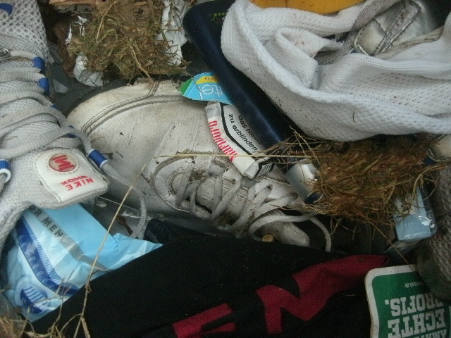 Alte, ausrangierte Sportschuhe, dreckige Strümpfe, ne verschwitzte Unterhose, Hygienetücher, Kronkorken von Erfrischungsgetränken, Bananenschalen und Duschgelflaschen, Kehricht und - zu meinem großen Erstaunen - vielzuviele Zigarettenkippen!!!