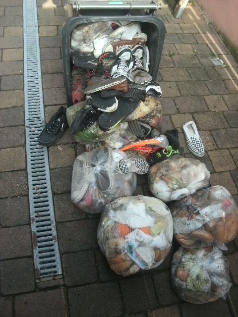 Sneaker, deren Schicksal zuerst noch nicht sicher war, mussten dann doch in den Müll und "bereicherten" unser "Müllkaleidoskop". Schön bunt war es allemal!