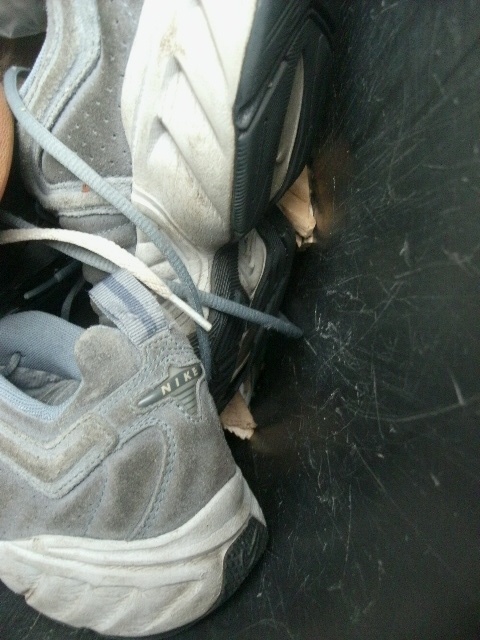 - Die Airpads der weggeschmissenen Nike TNs unter meinen Stollenschuhen geben meinen Füßen noch ein allerletztes Mal eine "Luftfederung" als sie eingestampft werden.