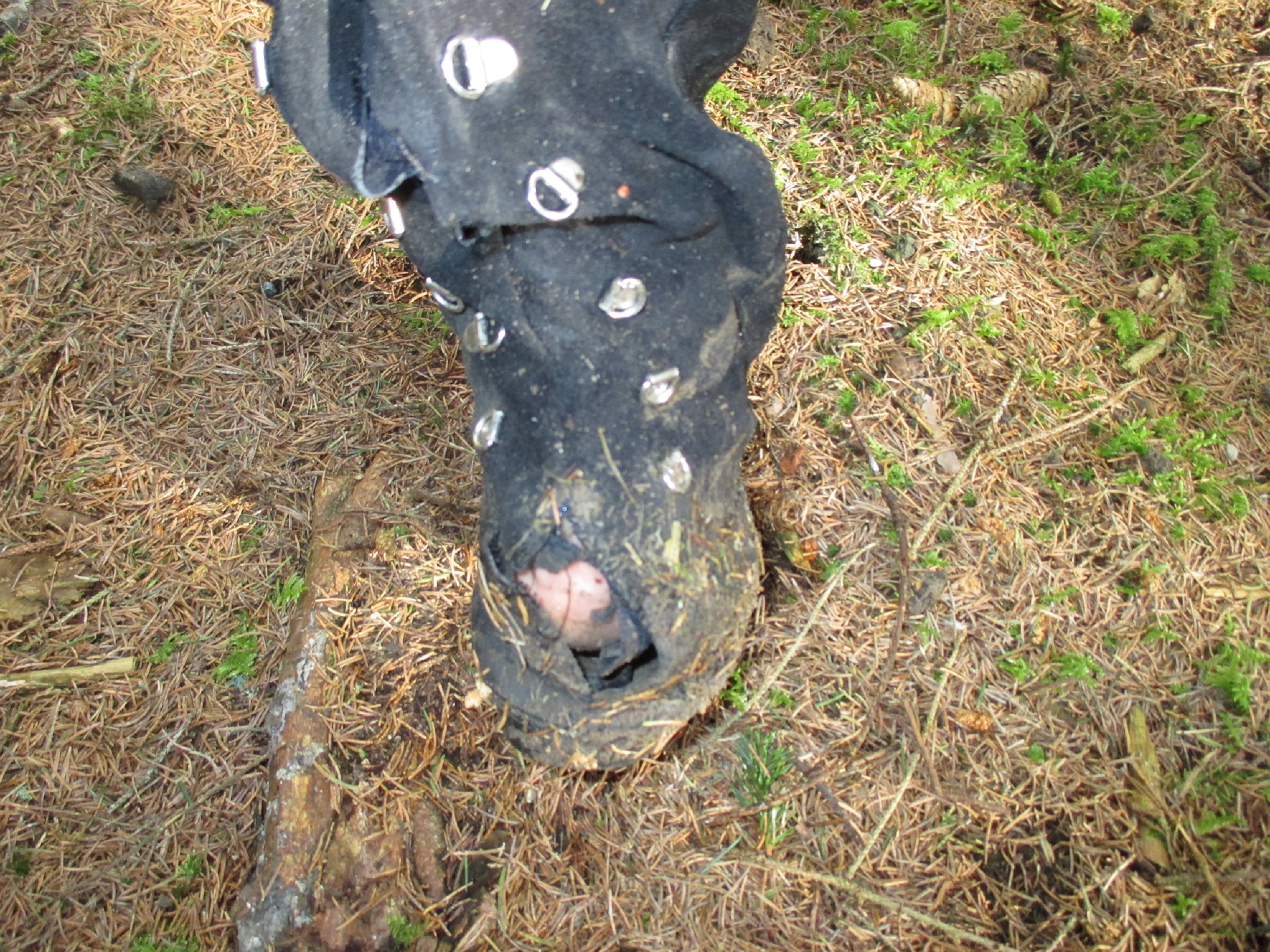 Allerdings ging bei dieser Aktion auch die Naht an der Ferse etwas auf. Macht ja nichts dacht ich mir. Die Stiefel sind sowieso dem Untergang geweiht. Als ich aber dann nochmals reinschlüpfte, wurde der Riss an der Ferse wesentlich größer, was mich aber nicht davon abhielt erneut mich in ein Schlammloch damit zu begeben, auch wenn somit die ganze Schlammsoße jetzt ungehindert in den rechten Stiefel floß.