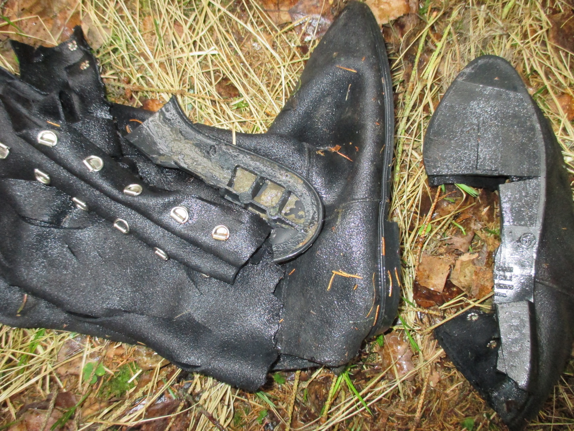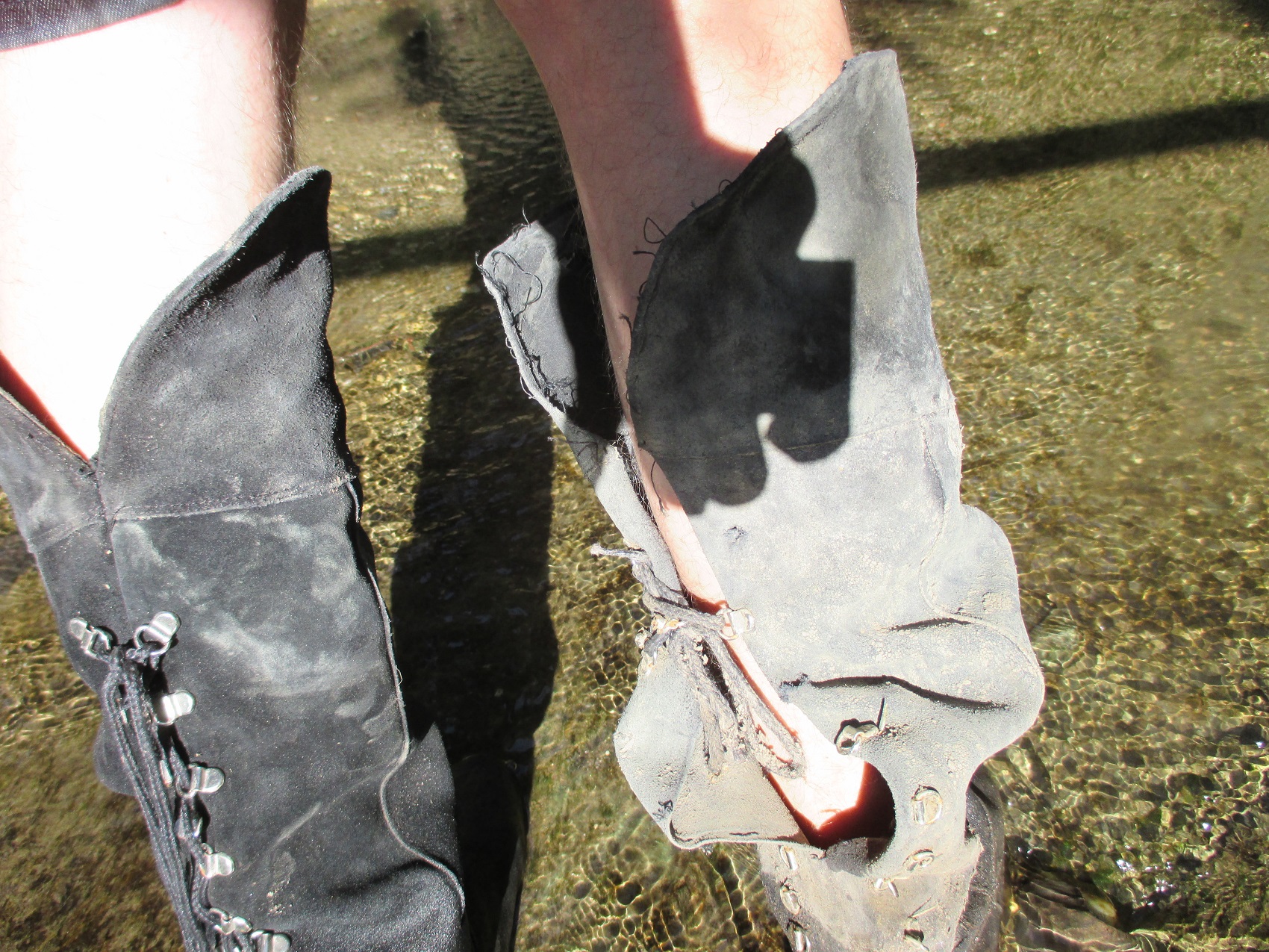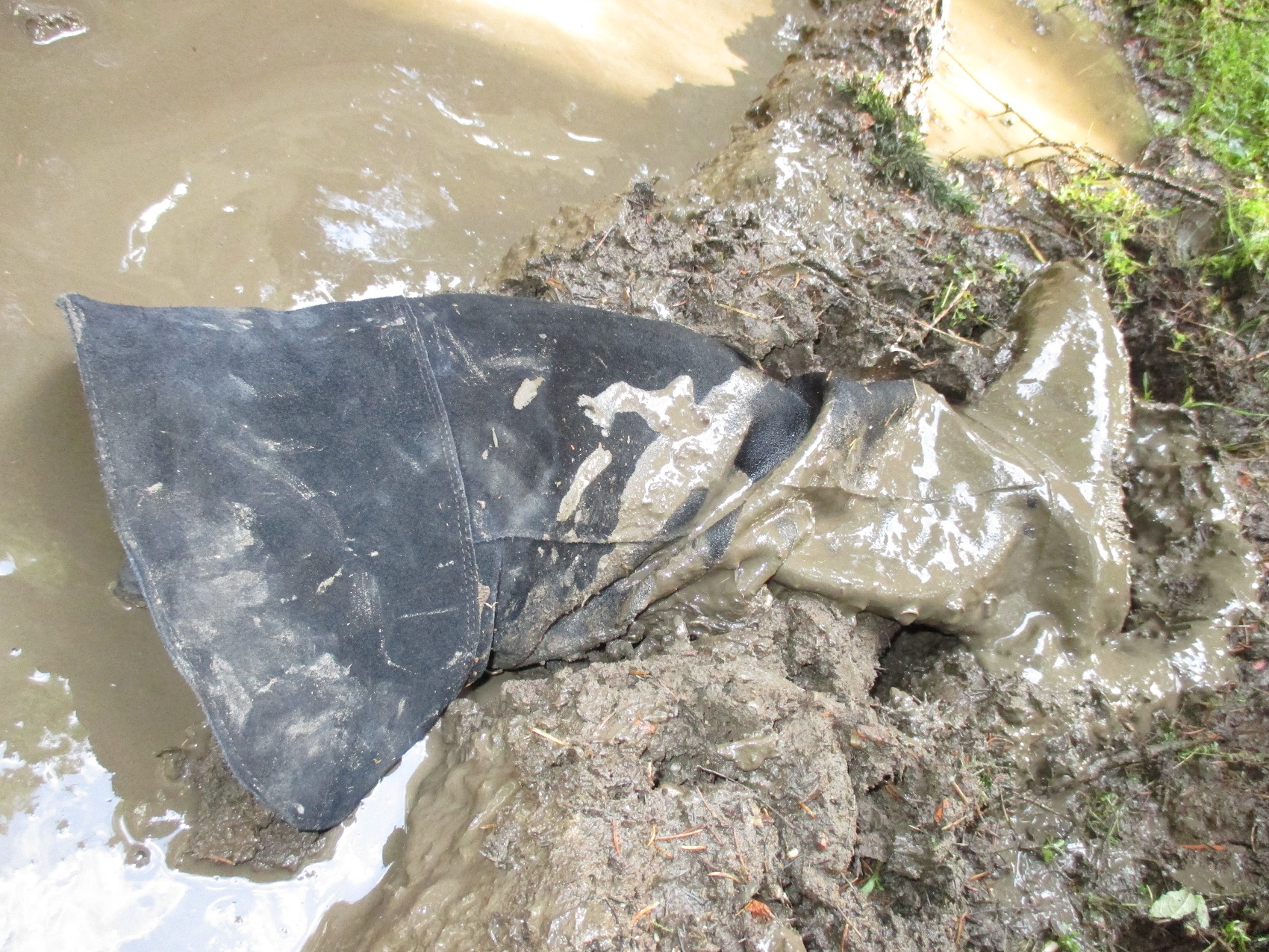 Allerdings ging bei dieser Aktion auch die Naht an der Ferse etwas auf. Macht ja nichts dacht ich mir. Die Stiefel sind sowieso dem Untergang geweiht. Als ich aber dann nochmals reinschlüpfte, wurde der Riss an der Ferse wesentlich größer, was mich aber nicht davon abhielt erneut mich in ein Schlammloch damit zu begeben, auch wenn somit die ganze Schlammsoße jetzt ungehindert in den rechten Stiefel floß.