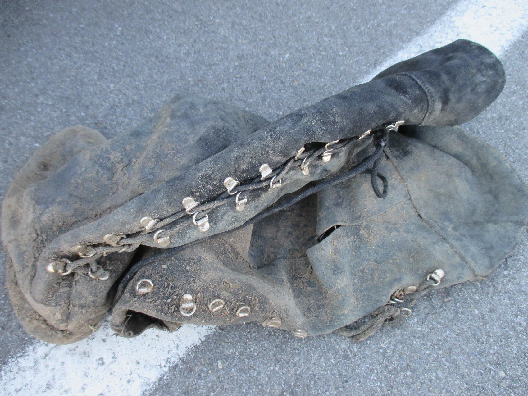 Nachdem sie wider trocken waren, hab ich sie auf dem heißen Asphalt fotografiert. Inzwischen ist die Naht am rechten Stiefel noch weiter aufgeplatzt, da ich die Nähte einer Belastungsprobe mit dem Wagenheber unterzogen habe. Und ich muß sagen, dass sie nicht sehr widerstandfähig waren. Aber was soll´s. Trotzdem ging es nochmal in den Wald hinaus, auch wenn der rechte Stiefel nur noch notdürftig am Fuß von den Schuhbändern gehalten wurde.