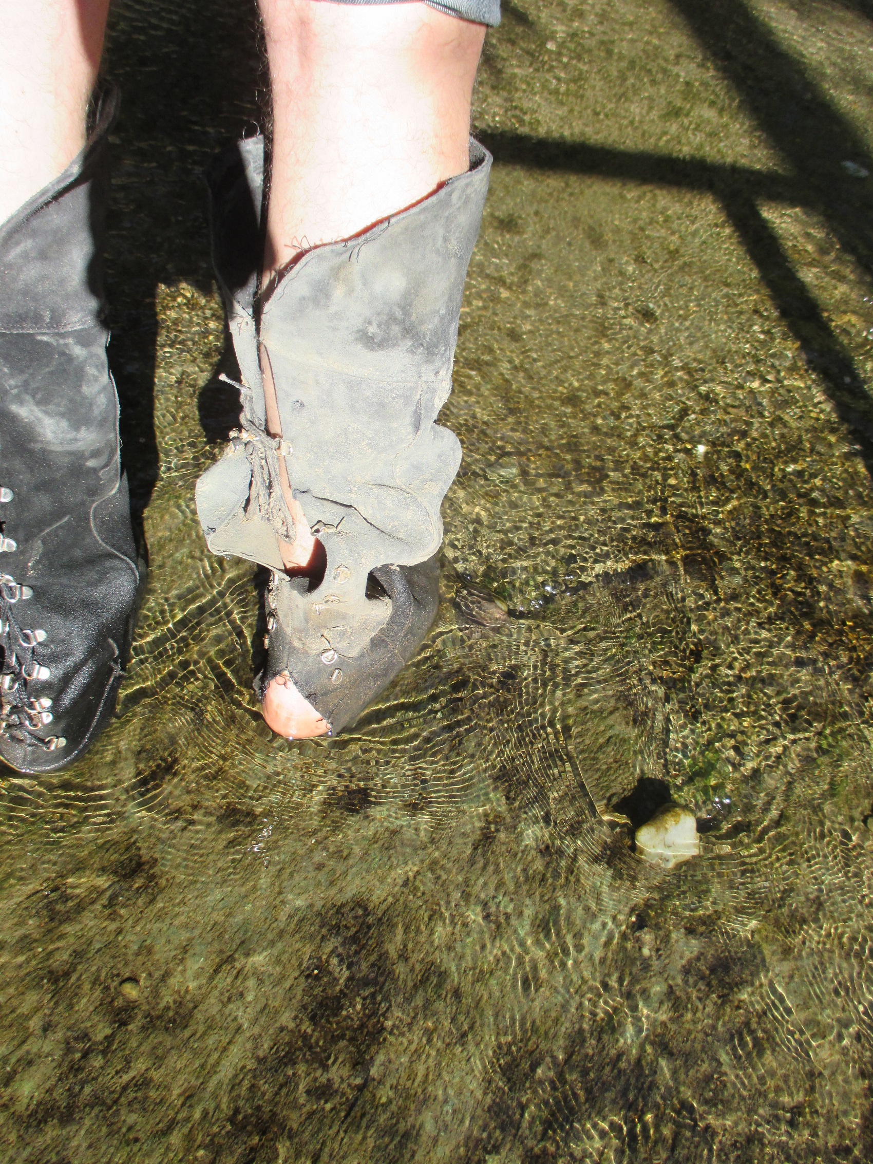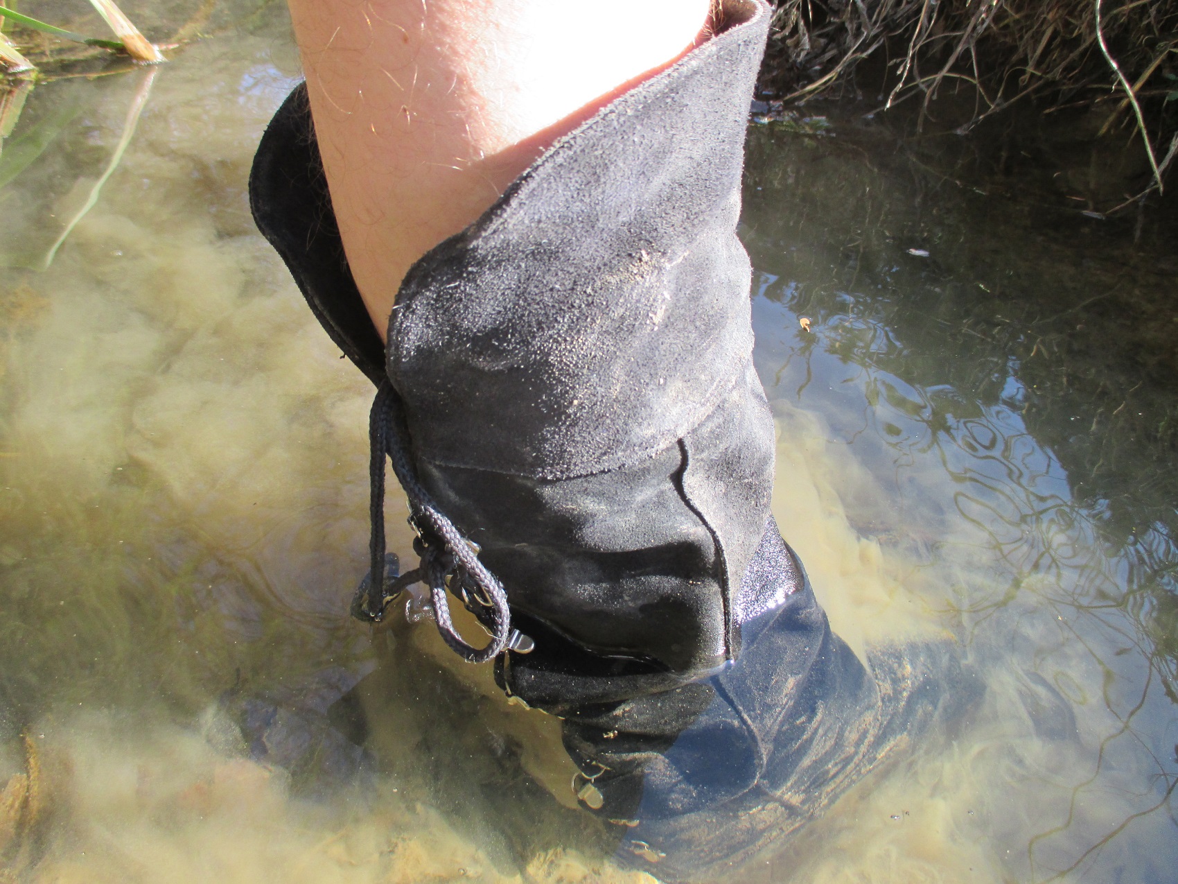Der linke, noch intakte Stiefel wurde einer gründlichen Waschung unterzogen. Ich ging immer tiefer rein, so tief, bis es oben reinlief; geiles Gefühl, wenn das Wasser an den langen Stiefelseiten innen runterläuft .