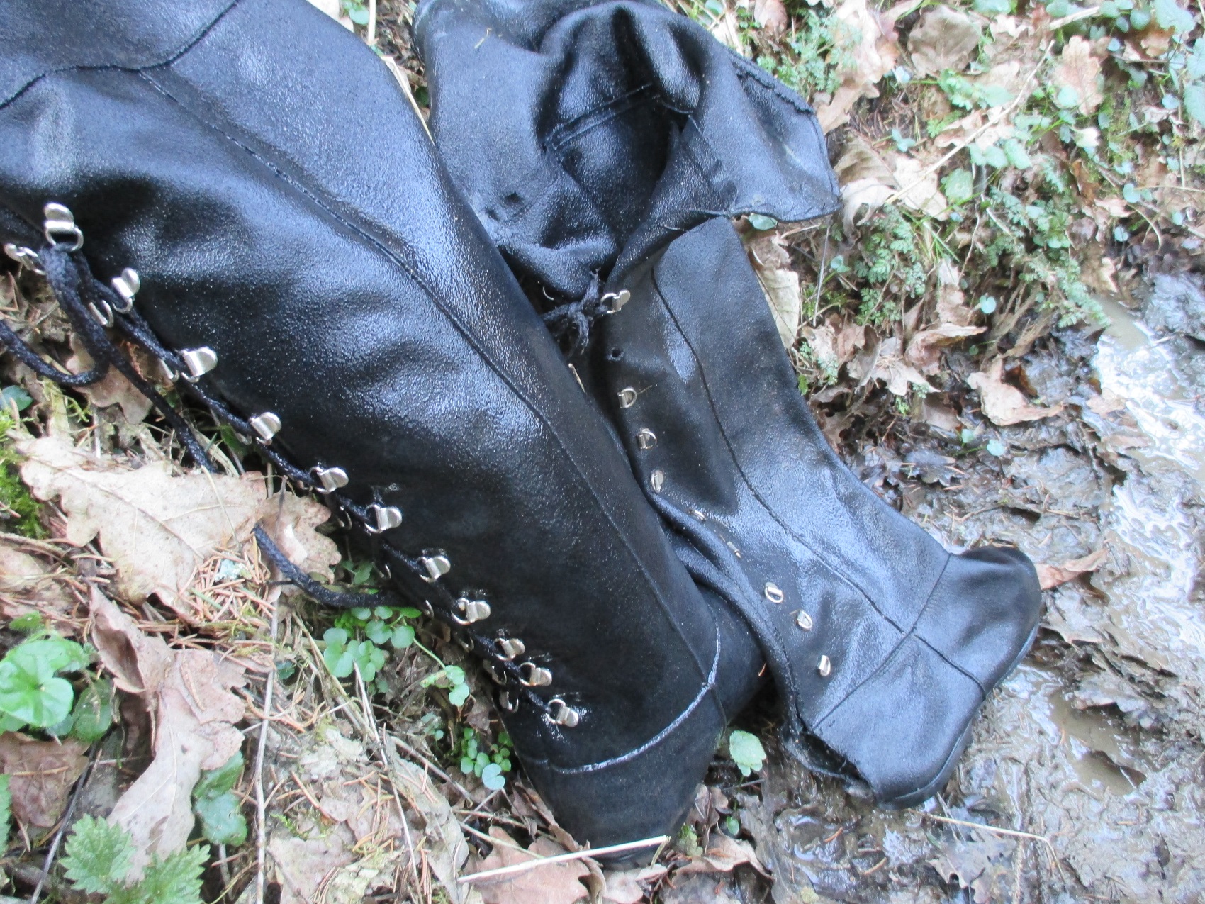 Was mir an dieser Unternehmung so gefällt, ist diese Ambivalenz bei diesen Stiefeln. Damit meine ich, dass sie irgendwann mal von einer Frau gekauft wurden, die sie stolz zum Ausgehen getragen hat und die auch darauf aufgepaßt hat, dass sie immer schön sauber bleiben. Und nachdem sie sich von den Stiefeln getrennt hat, kann ich sie jetzt nach Herzenslust einsauen.