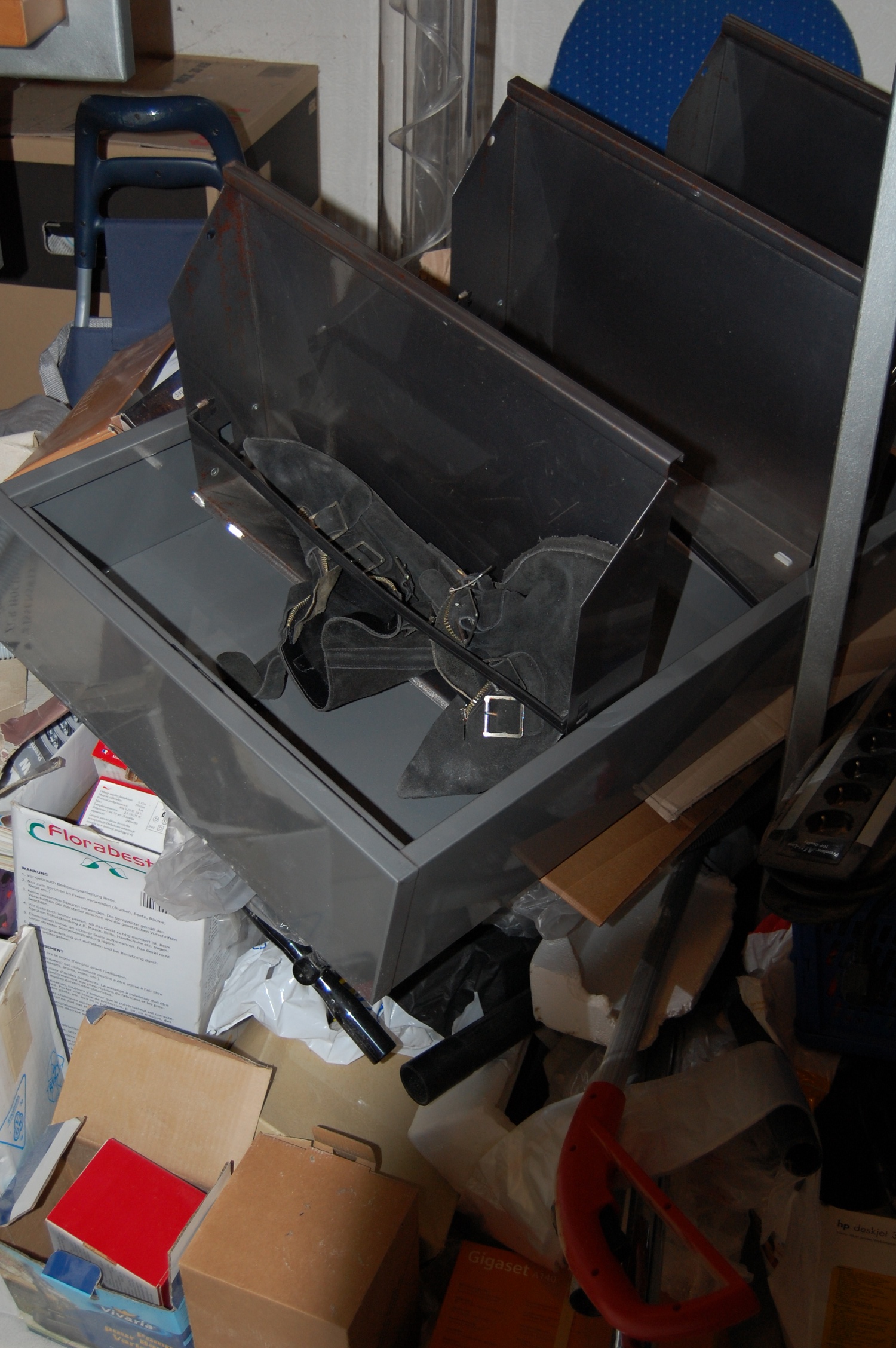 Dies erwies sich als sehr praktisch, weil sodann der Partner meiner Mutter mit dem ausrangierten Metallschuhschrank kam und diesen auf dem hauseigenen Müllberg drapierte. Als er die alten Schuhe sah, nahm er sie aus dem Dreck und steckte sie verschmitzt in eine der Laden mit dem Kommentar: da gehören sie doch eigentlich hin.