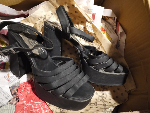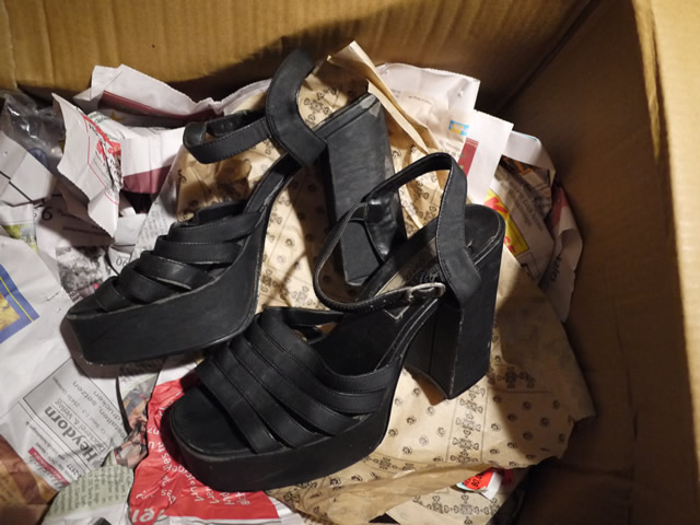 Unter dem Tisch stand ein gut gefüllter Karton für die Papierreste, in dem eines Tages auch ein Paar ihrer alten 70er Plateausandaletten lag. Die ausgelatschten Schuhe lagen einige Tage in dem Karton und ich habe als Kind damals mit den Dingern gespielt, wenn niemand zusah. Hab sie angezogen, daran gerochen und bin mit ihnen herumgelaufen.
