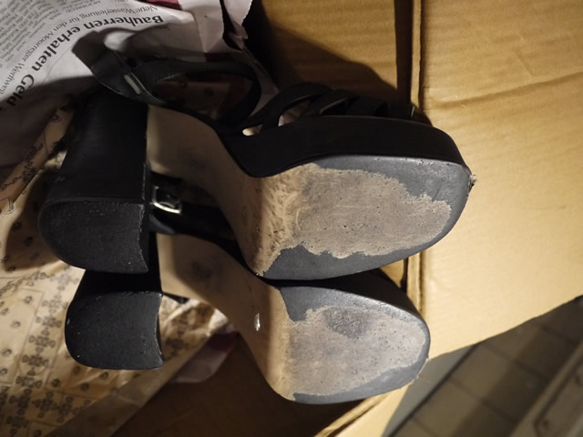 Unter dem einen Plateau ist vermutlich ein Kaugummi, ansonsten sind die Absätzflecken noch gerade nur so schief gelatscht, dass die Absätzs der Heels selbst noch in Ordnung ist. Die Spitzen sind schon leicht durchgeschürft.