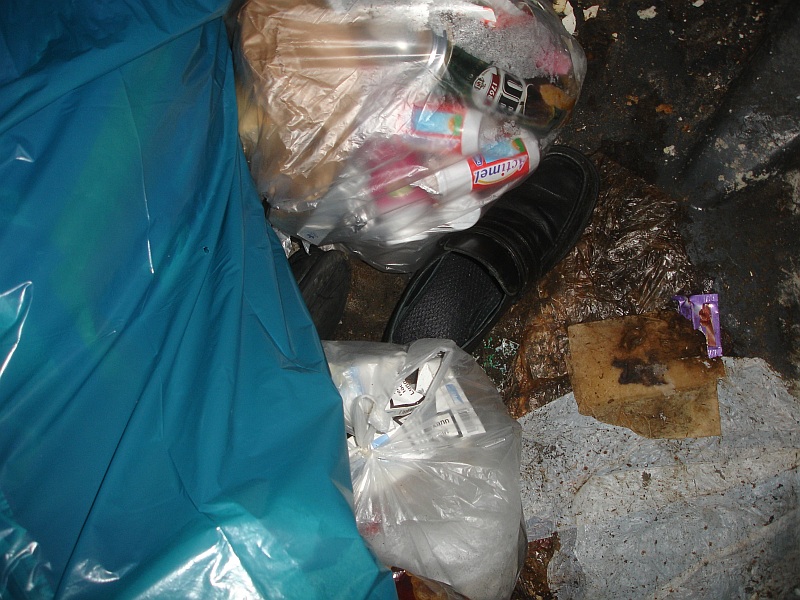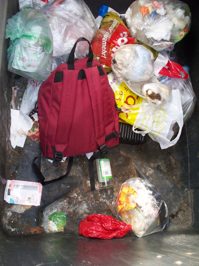 Am vergangenen Freitagspätnachmittag ging ich (wieder einmal) über die Wege einer Wohnblocksiedlung zur dortigen Innenstadt und da fiel mir eine große Frau mit langen blonden Haaren auf, welche im Laternenlicht schimmerten, wie sie gerade einen Müllcontainerstandplatz verließ und ins Haus ging. Sie war gut gekleidet, hatte aber Hausschlappen an den Füßen. Einer Eingebung folgend inspizierte ich mal die Müllcontainer und ... Bingo