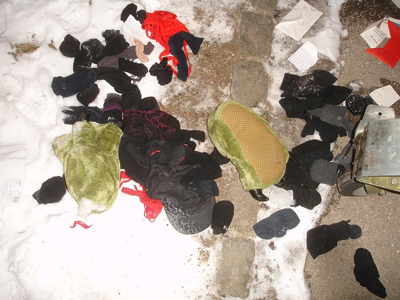 da sind wieder sehr geile weil authentische Bilder zu betrachten. Besonders die vielen süßen Sneakersöckchen und die BHs finde ich geil, wie sie in der Kälte liegen. Das sieht fast so aus, dass ein großer Müllsack in den Müllcontainer von der FRau geworfen wurde und ein "Müllfledderer" hat den hochgezogen und durchgewühlt. Die "Kleinteile" hat der Chaot einfach auf dem Boden liegen lassen. Aber du hast ja wohl hoffentlich dem Hausmeister die Arbeit abgenommen und alles sauber abgeräumt - und natürlich mitgenommen und gerettet?!