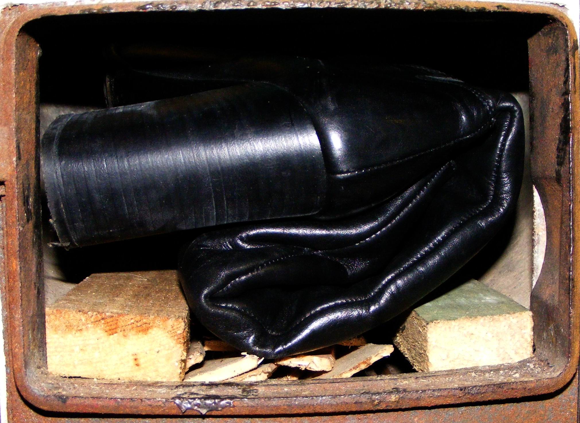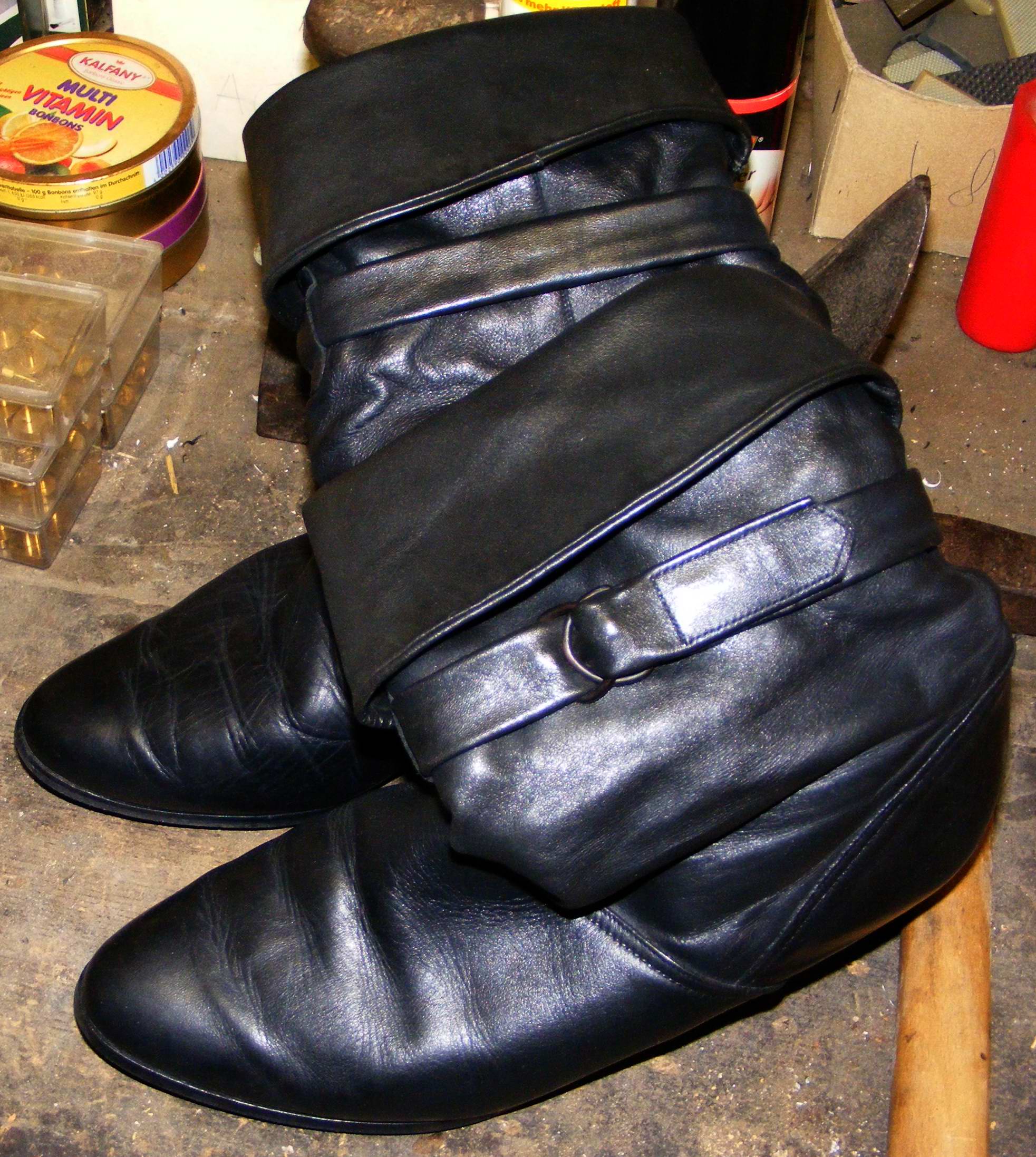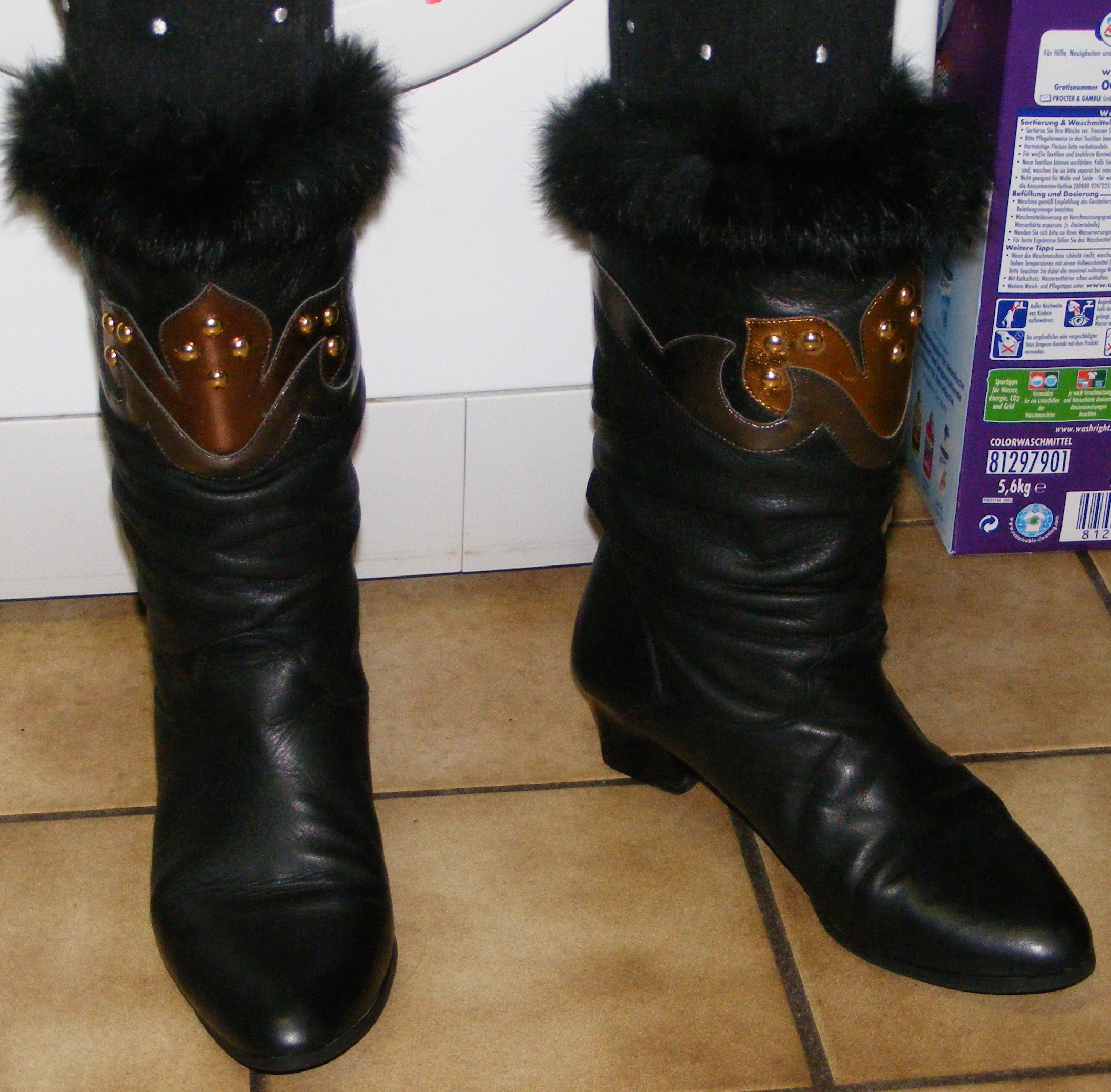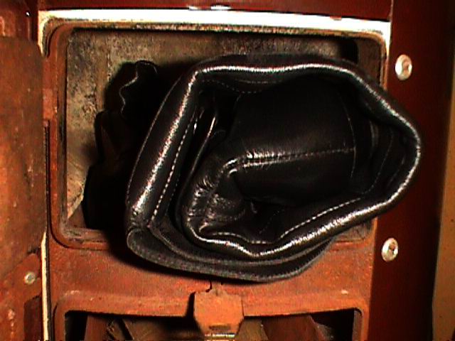 Oh, das ist mindestens zwei Jahre her. Es stand mal wieder ein "Wandertag" an. Dafür hatte ich mir eigentlich ein Paar weiche, bequeme schwarze Westernstiefel aus Echtleder vorbereitet. Doch der Wetterbericht sagte übles Regenwetter voraus. Ich erinnerte mich dieser Sperrmüll-Beute, die ich wohlwissend für einen eventuell mörderischen Einsatz noch beiseite gelegt hatte. Ich tat gut daran, diese zu erwählen, denn es ging kilometerweit über nasse grasige Hügel. Ich muß sogar zugeben, daß sie für meine breiten Füße (wie man deutlich sehen kann) sogar richtig angenehm zu tragen waren! Doch wenn man genau hinsieht, hat die schonungslose Nutzung dem Synthetik-Material extrem zugesetzt. Es bekam Risse. Ohne nochmalige Pflege kamen sie wieder in den Keller. Ich habe sie dann im Winter noch einige Male beim Schneefegen getragen, wobei, wenn ich mich recht erinnere, eine Sohle durchgebrochen war. Sie kamen dann direkt in den Heizungsofen. Aber es gab keine besondere "Zeremonie". In der einen Hand hielt ich die beiden Stiefel, mit der anderen Hand öffnete ich die Feuertür. Dann warf ich die Stiefel gleichzeitig auf die hell und kräftig brennenden Kohlen und machte die Tür gleich wieder zu. In dieser Flammenhölle dürften sie nicht lange gelitten haben!