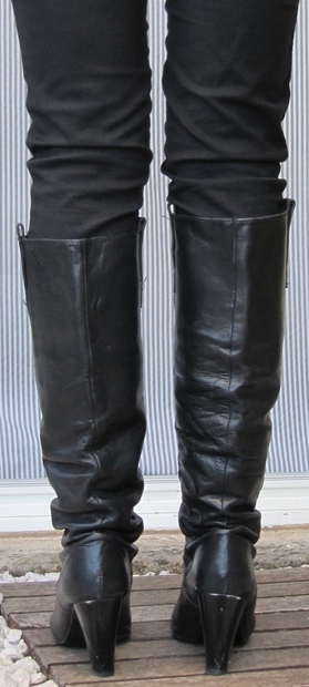 Ehe diese Frage kommt: Warum ich keine neuen Schuhe/Stiefel mag? Deren Unberührtheit macht mich nicht an, neue Schuhe haben noch keine Erlebnisse gespeichert (und ich mag mir nur ungern Blasen holen :P ). Ich bin also nicht die allseits bekannte, von der Mode zu De...mann usw. getriebene und somit die abartigsten Treter ablatschende, "schuhverrückte Frau", sondern eben eher eine wirkliche Liebhaberin zeitlos schöner und erhaltenswerter Schuhe/Stiefel, die sich niemals mit widerlichen Synthetik-Plateaus ihre "süßen Füßchen" :P ruinieren würde!