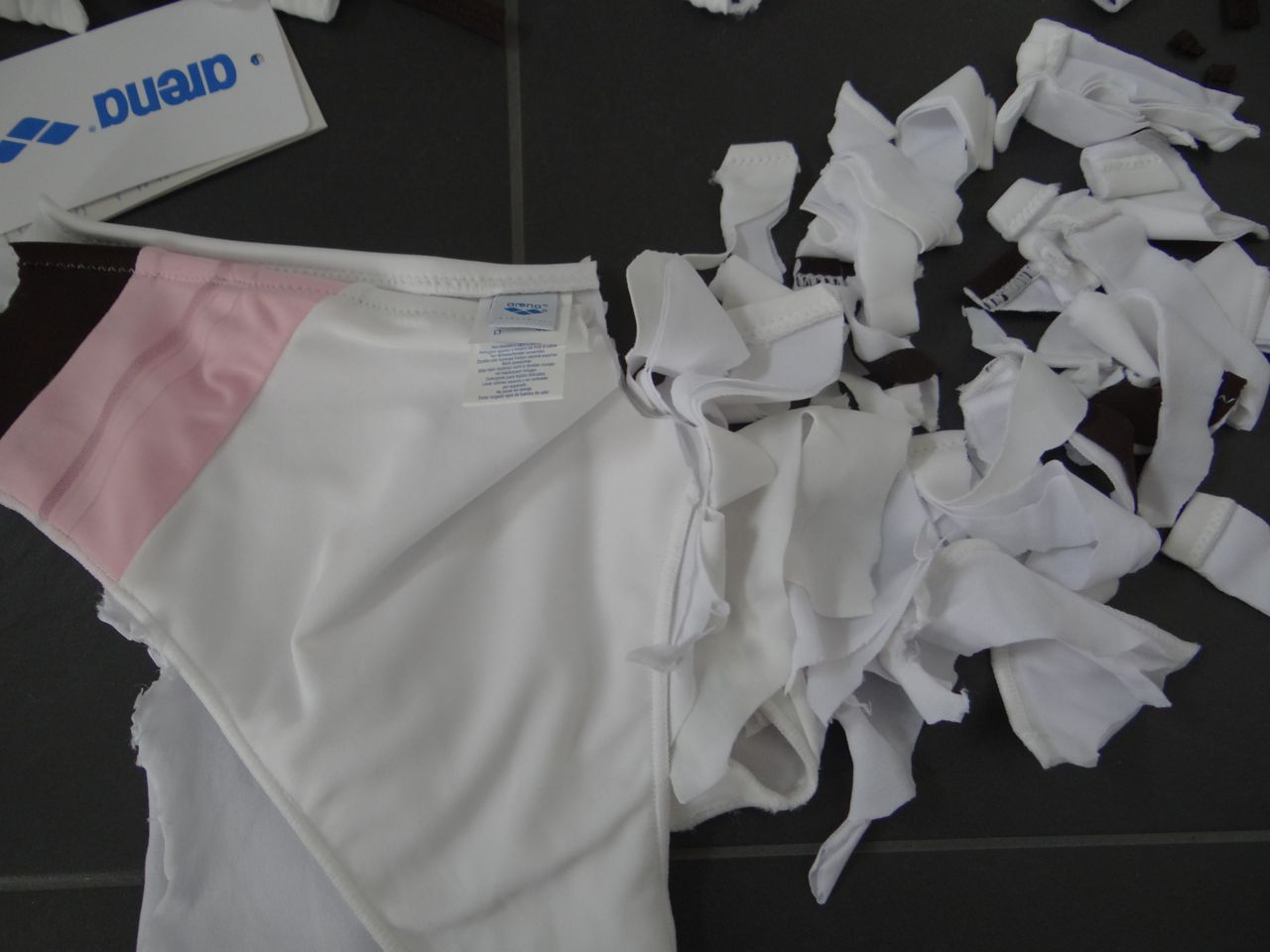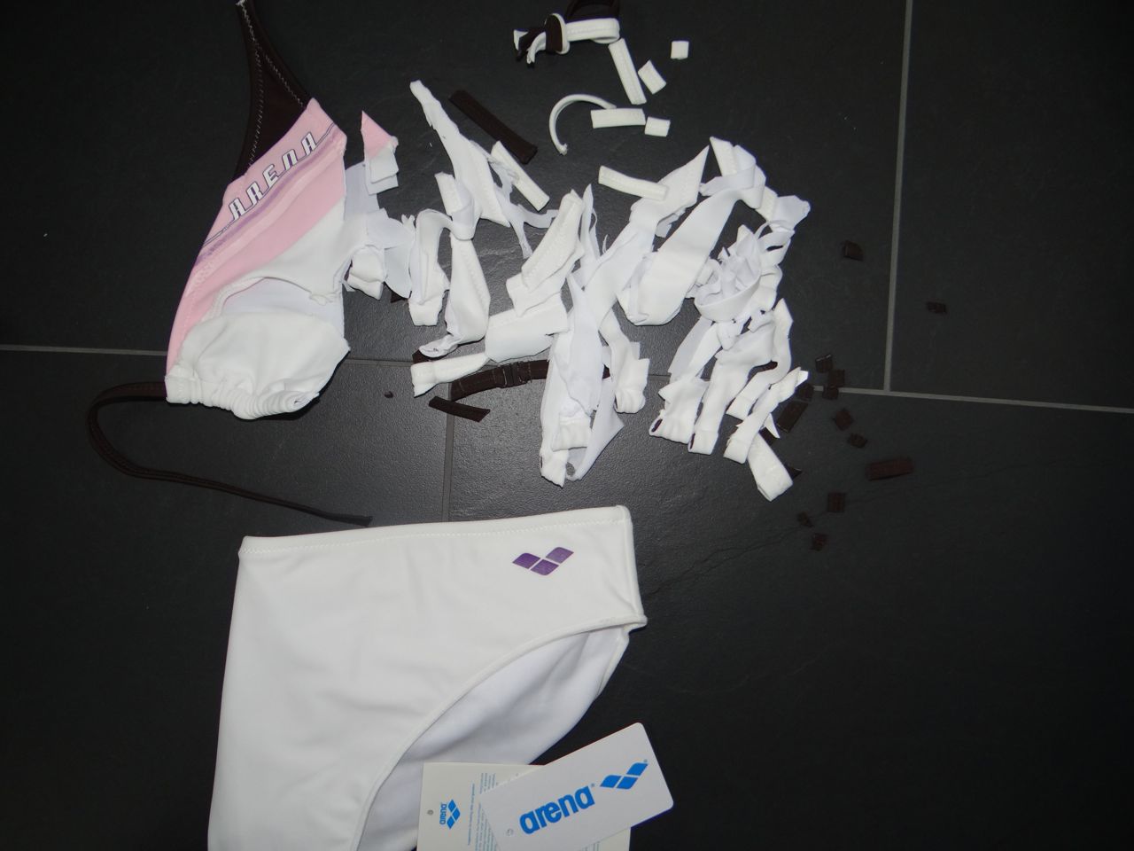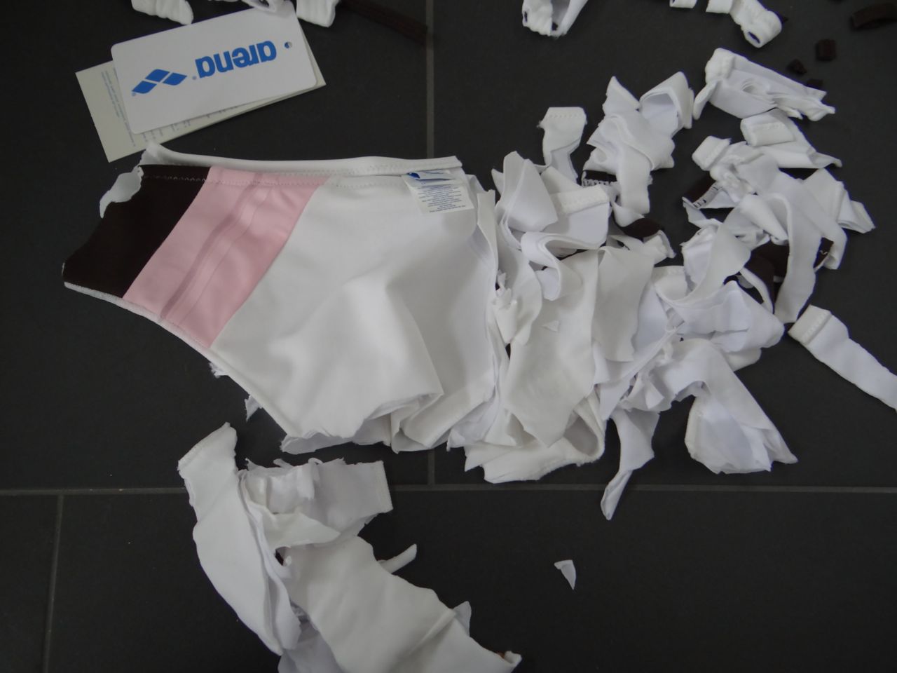 Heute musste mein neues Arena Bikini dran glauben... einfach so. Es gefällt mir nicht mehr. Es ist von letzter Saison, und kostete 70Euro... dafür lässt wichs schön zerfetzen. Material: 80% Polyamid, 20% Elasthan.