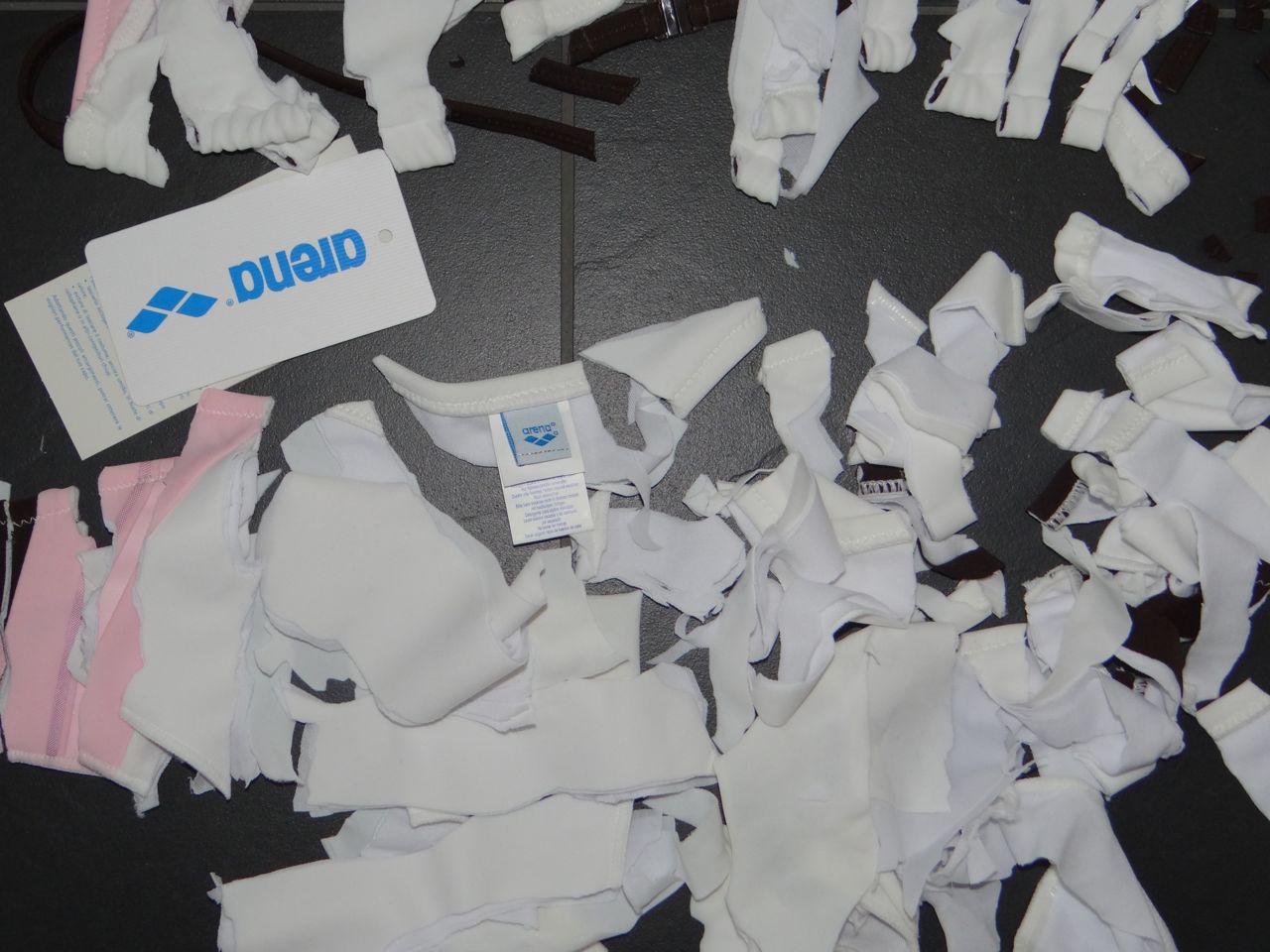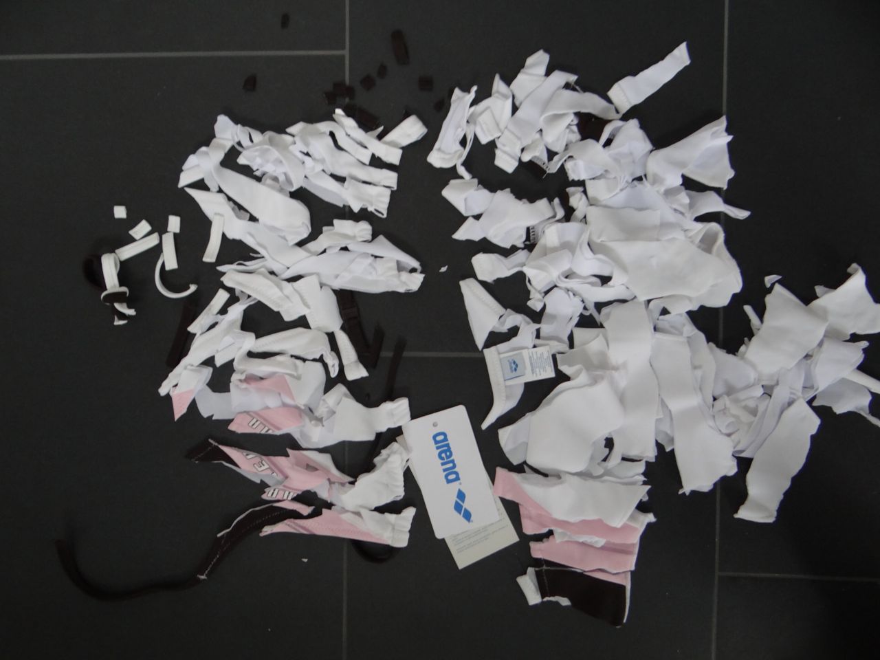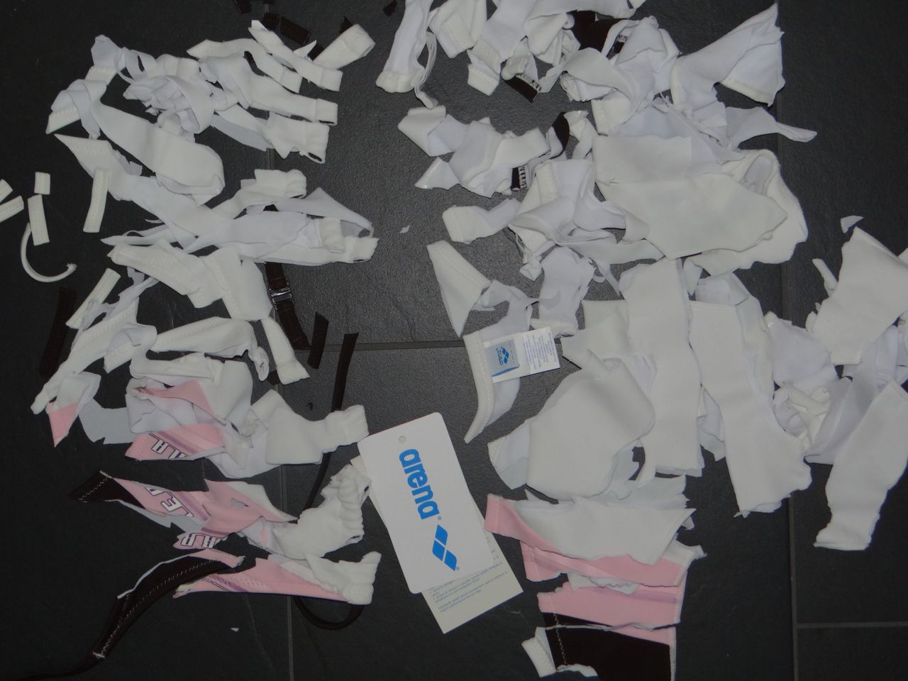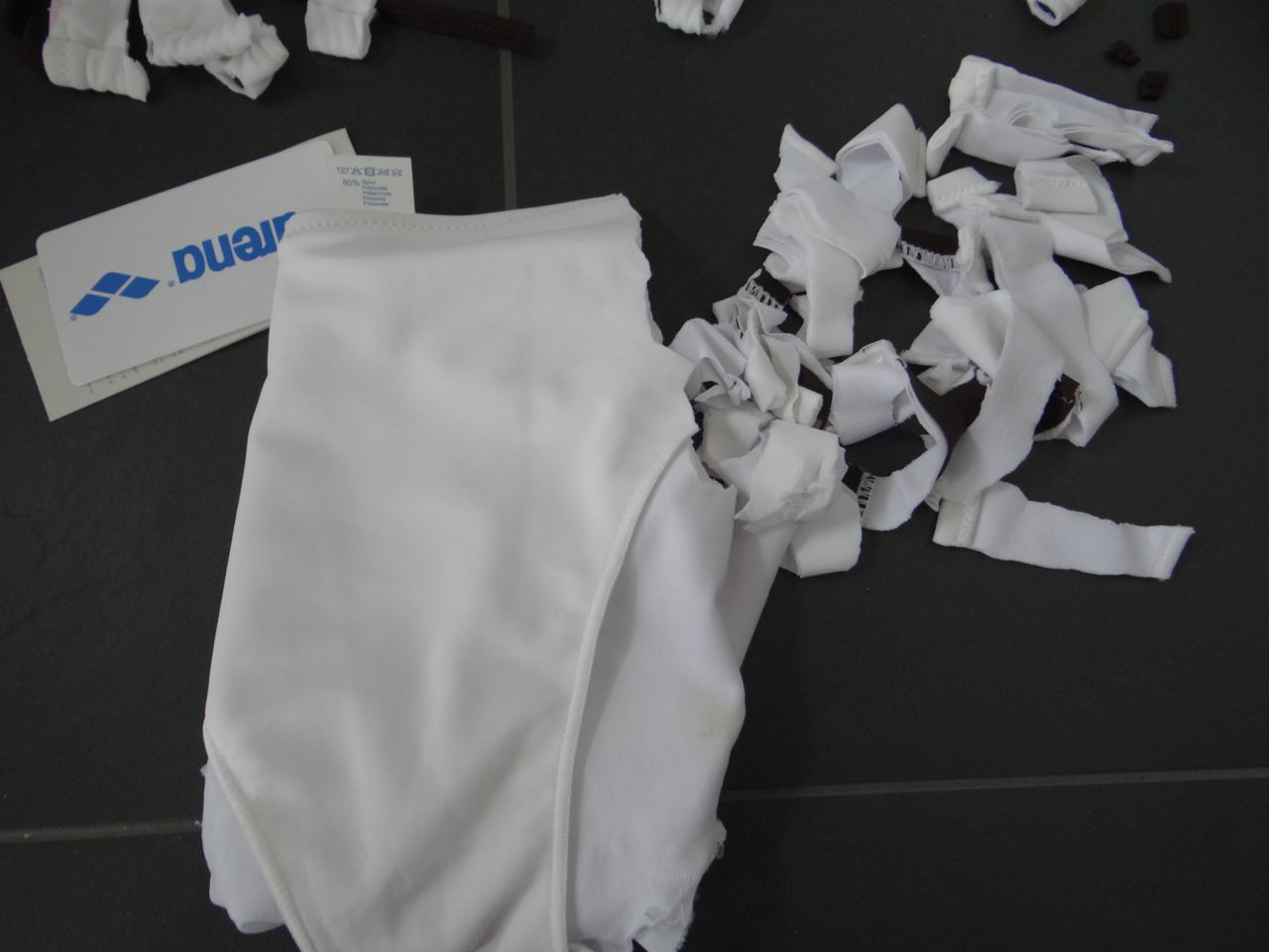 Heute musste mein neues Arena Bikini dran glauben... einfach so. Es gefällt mir nicht mehr. Es ist von letzter Saison, und kostete 70Euro... dafür lässt wichs schön zerfetzen. Material: 80% Polyamid, 20% Elasthan.