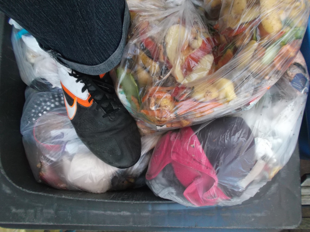 Der ganze Dreck musste dringend eingestampft werden, denn so hätte die Müllabfuhr unsere Tonne stehen lassen!
