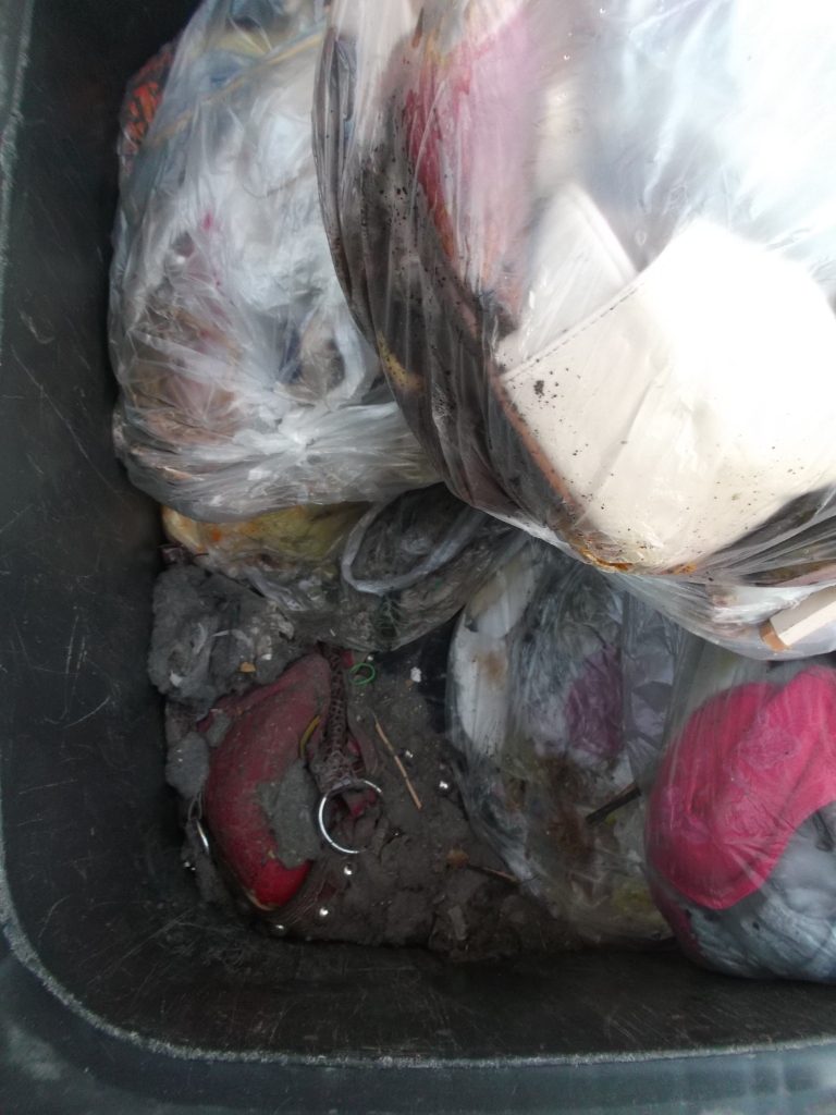 der Küchenmüllbeutel mit den weggeschmissenen Stiefeln von Anja lag nun wie zu erwarten in unserer Restmülltonne und der war so prall voll gestopft worden, dass er beim in die Mülltonne werfen sogar ein wenig aufplatzte. Aber er hatte ja lange genug den ganzen Dreck zusammen gehalten: :mrgreen: