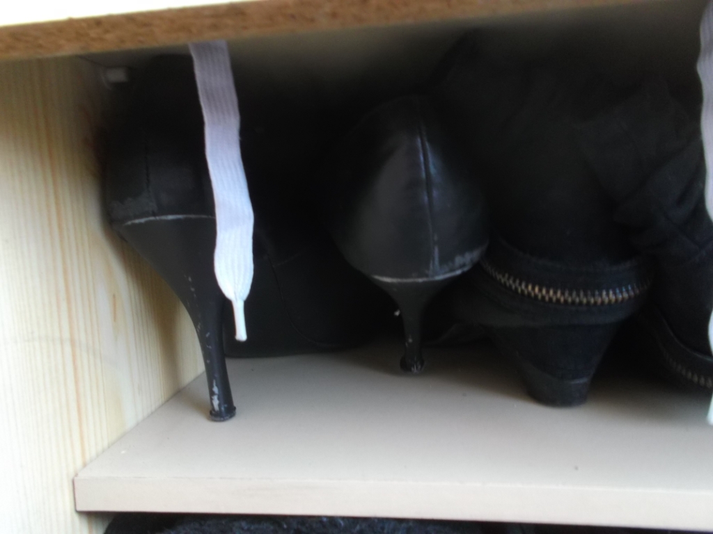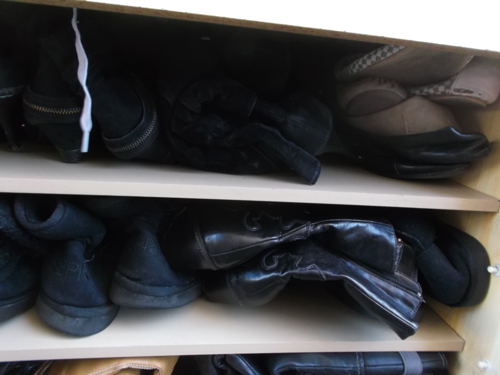Zwischen den Pumps (links) und dem Stapel abgelatschter Ballerinas lagen sehr geile Stiefeletten und hohe Wildlederstiefel und darunter einige total kaputt gelatschte UGGs.