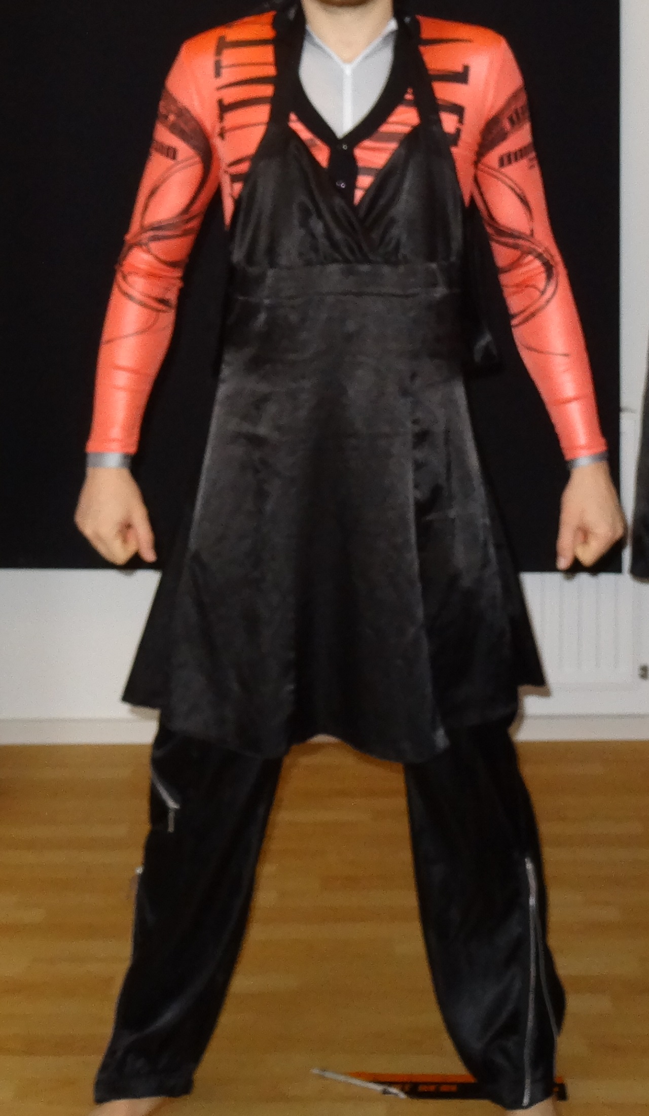 Und eine schwarze Satin Hose kombiniert mit dem Orangen shirt