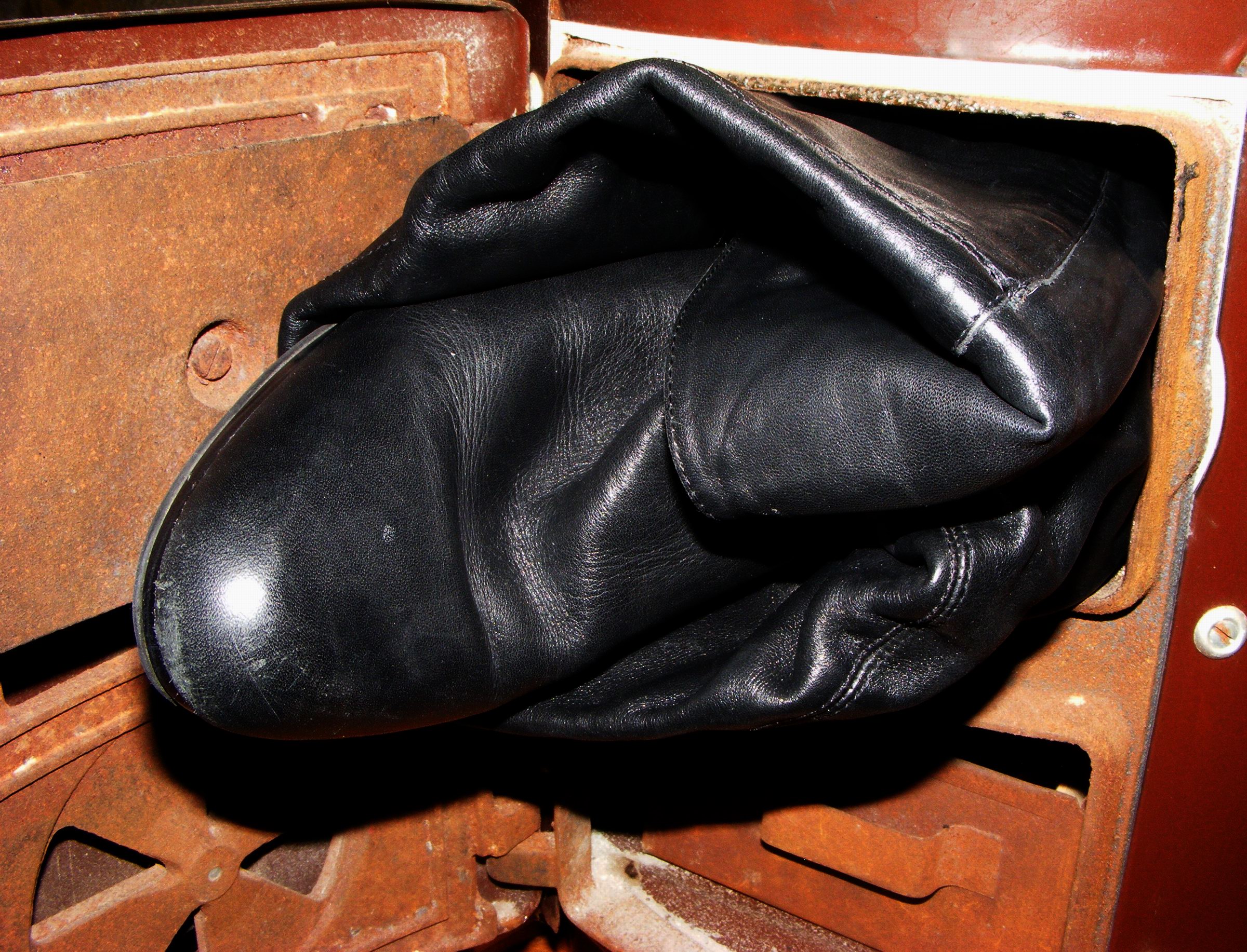 Apropos Volumen: Der Wildleder-Overknee braucht ganz schön viel Platz im Badeofen. Sonst passen doch meist auch zwei Stiefel in die Brennkammer. Bisher gefielen mir Overknees immer nur, weil diese Stiefel unsere Frauen immer so unglaublich schmücken. Jetzt wird mir aber auch klar, dass diese langen Stiefel einen wesentlich größeren Heizwert haben als Stiefletten. :lol: